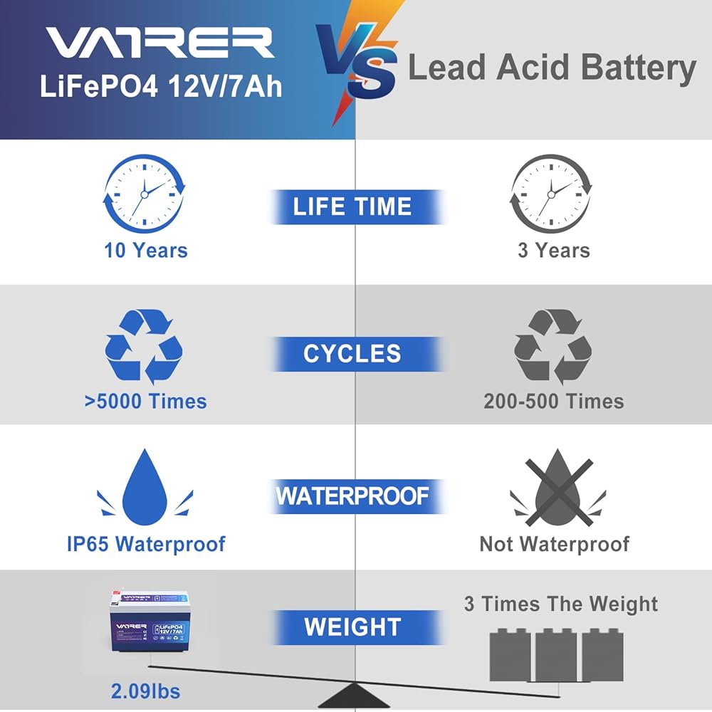 【طول عمر استثنائي وخفيف الوزن】 توفر بطاريات حديد الليثيوم LiFePO4 لدينا أكثر من 5000 دورة مقارنة بـ 300 ~ 500 دورة في بطارية حمض الرصاص. عمر خدمة بطاريات LiFePO4 هو 8 إلى 10 أضعاف عمر بطاريات الرصاص الحمضية القياسية. المساعدة في تقليل تكاليف الاستبدال وتقليل التكلفة الإجمالية للملكية. ووزن بطارية ليثيوم فوسفات الحديد أخف بنسبة 30% من بطارية الرصاص الحمضية بنفس السعة، لذلك يمكنك حملها بسهولة أكبر. (ملاحظة: يرجى قياس المساحة التي ستستخدمها بدقة أولاً لتجنب عدم تطابق حجم البطارية)