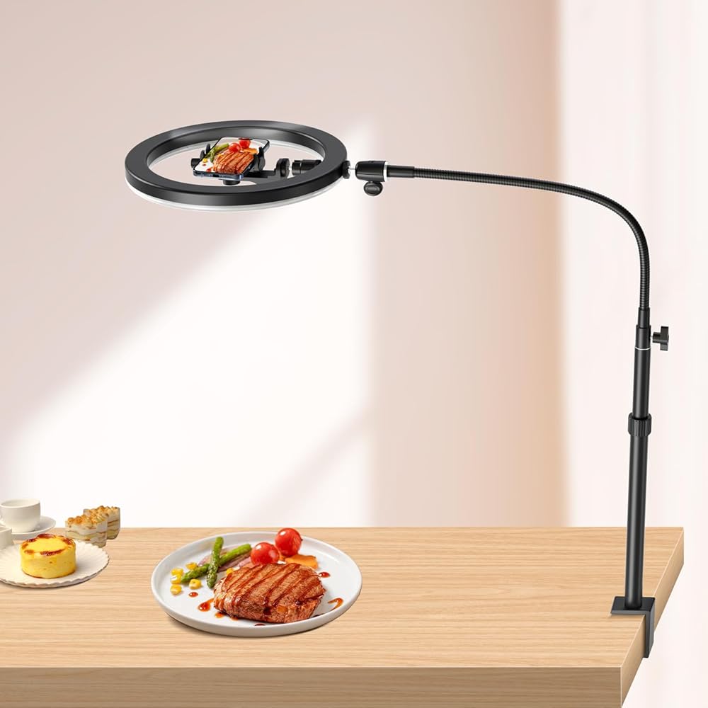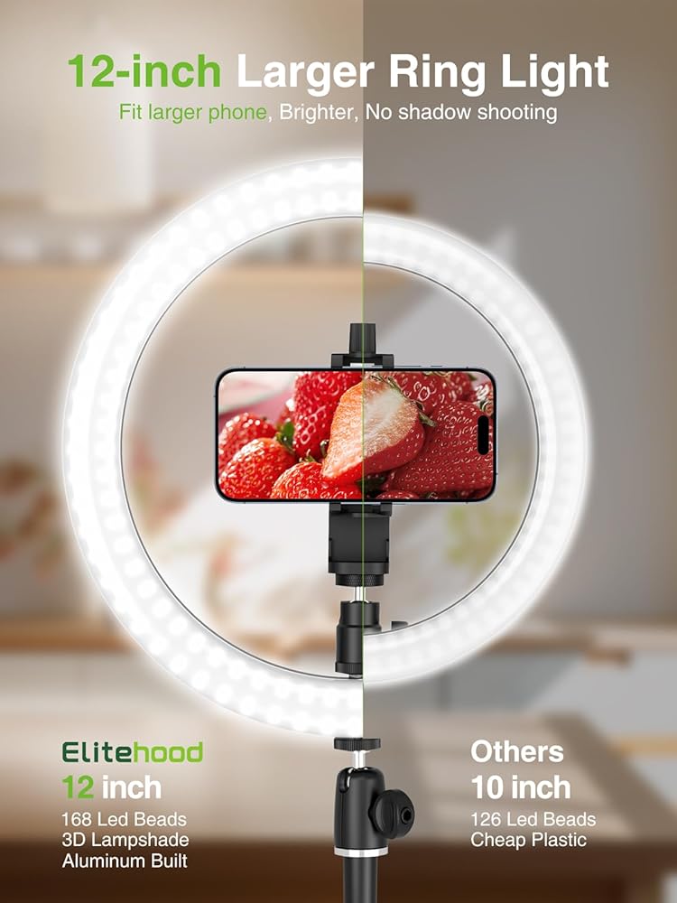 حامل هاتف علوي من Elitehood، مصباح حلقي علوي كبير مقاس 12 بوصة مع حامل وحامل هاتف، حامل هاتف قابل للتعديل مع ضوء لتسجيل الفيديو، متوافق مع هواتف iPhone وAndroid