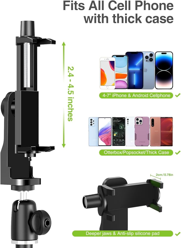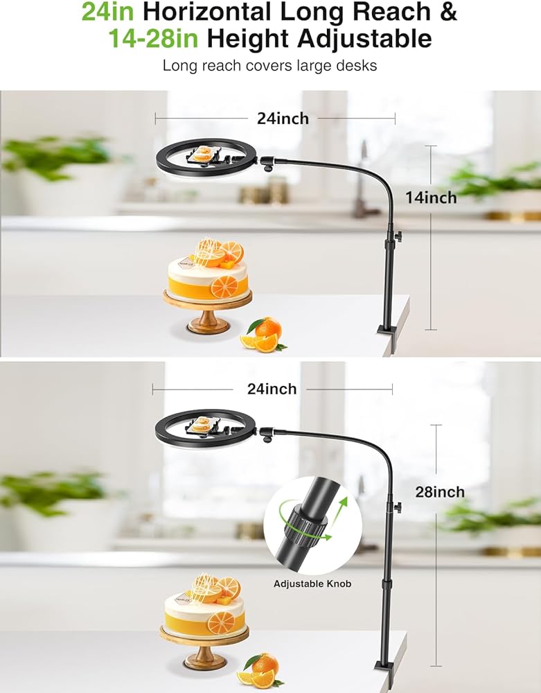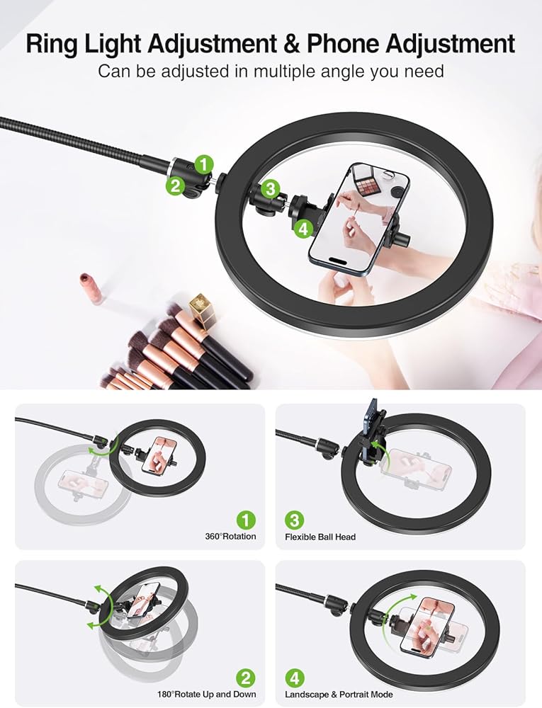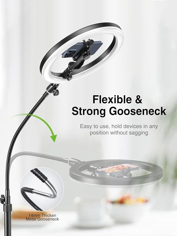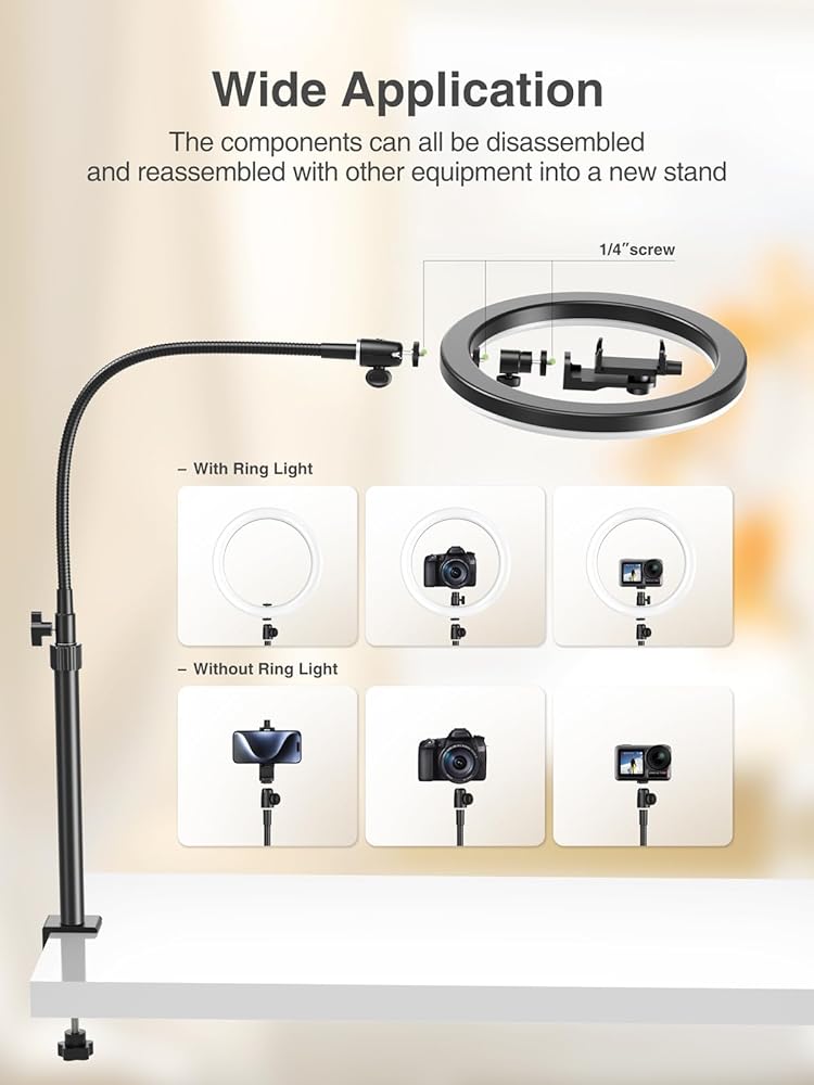 • 【توافق واسع】يدعم حامل الهاتف العلوي هذا للتسجيل جميع موديلات الهواتف المحمولة. يتميز بمسامير 1/4 على عنق الإوز وداخل الضوء الدائري للتوافق مع المعدات المختلفة. يمكنك إزالة الضوء الدائري وتوصيل حامل الهاتف أو كاميرا الويب أو الكاميرات الرقمية أو GoPro مباشرةً برقبة الإوز، وتحويله إلى حامل هاتف مكتبي، أو حامل كاميرا علوي، أو مصباح طاولة. بالإضافة إلى ذلك، يمكنك تركيب أجهزة أخرى مثل الكاميرات أو كاميرات الويب أو GoPros على وحدة الإضاءة.