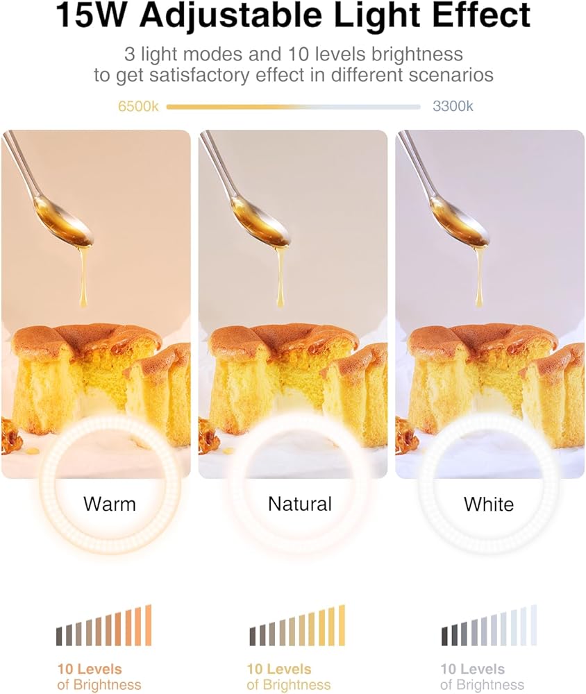 • 【أكثر سطوعًا وأكثر تنوعًا】مصنوع من هيكل من سبائك الألومنيوم خفيف الوزن و168 قطعة SMD LED، هذا الضوء للتسجيل أكثر إشراقًا وأكثر متانة من الضوء الحلقي الآخر مع 128 خرزة فقط في غلاف بلاستيكي. قوة عمل تصل إلى 15 وات (تعمل بمنفذ USB)، تدعم 10 مستويات سطوع و3 أوضاع ألوان - ضوء دافئ/طبيعي/أبيض، مما يوفر جودة احترافية وخالية من الظلال وانتشار نظيف للضوء لتسجيل الفيديو والتصوير الفوتوغرافي وكاميرا الويب. وفيديو يوتيوب والبث المباشر والمزيد.