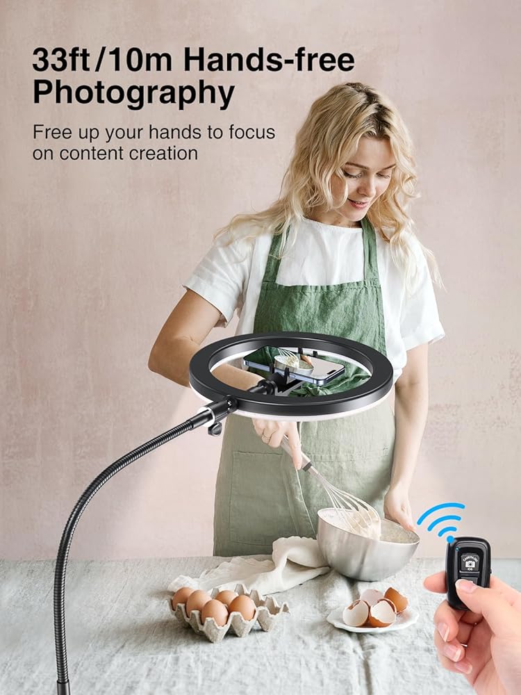 • 【تعديل متعدد الزوايا】يوفر حامل الهاتف العلوي هذا خيارات تحديد المواقع المختلفة من أجل راحتك. يتميز الجزء العلوي من رقبة الإوزة برأس كروي، مما يسمح بالدوران الحر وإمالة الضوء الدائري. عند ضبط زاوية الهاتف، قم بالتبديل بين الوضع الرأسي والأفقي وقم بضبط المفصل الكروي على المصباح للحصول على زوايا تصوير مثالية. يأتي مع جهاز تحكم عن بعد يعمل بتقنية البلوتوث، هذا المصباح الدائري العلوي مثالي لالتقاط اللقطات أثناء الطهي والرسم والرسم وفن الأظافر.
