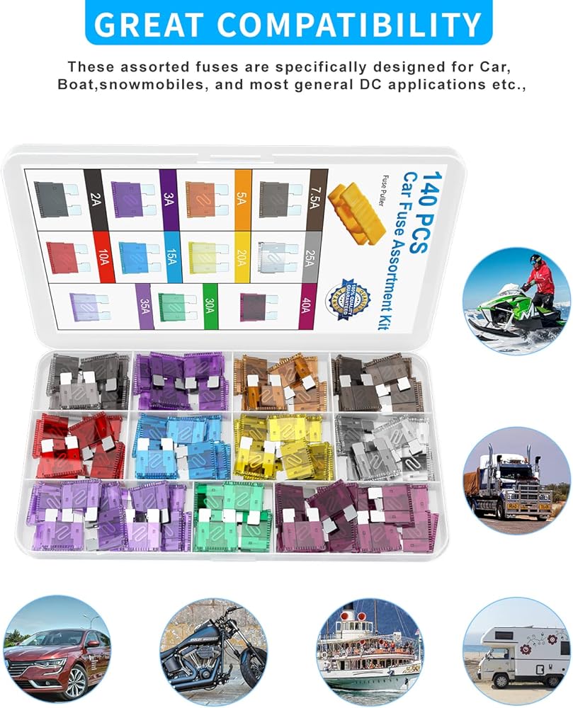 صمامات السيارة - 140 قطعة مجموعة متنوعة من صمامات السيارة القياسية، استبدال صمامات السيارات (2A 3A 5A 7.5A 10A 15A 20A 25A 30A 35A 40AMP) لشاحنة RV Camper Auto Motorcycle Truck ATV UTV Car Boat Marine