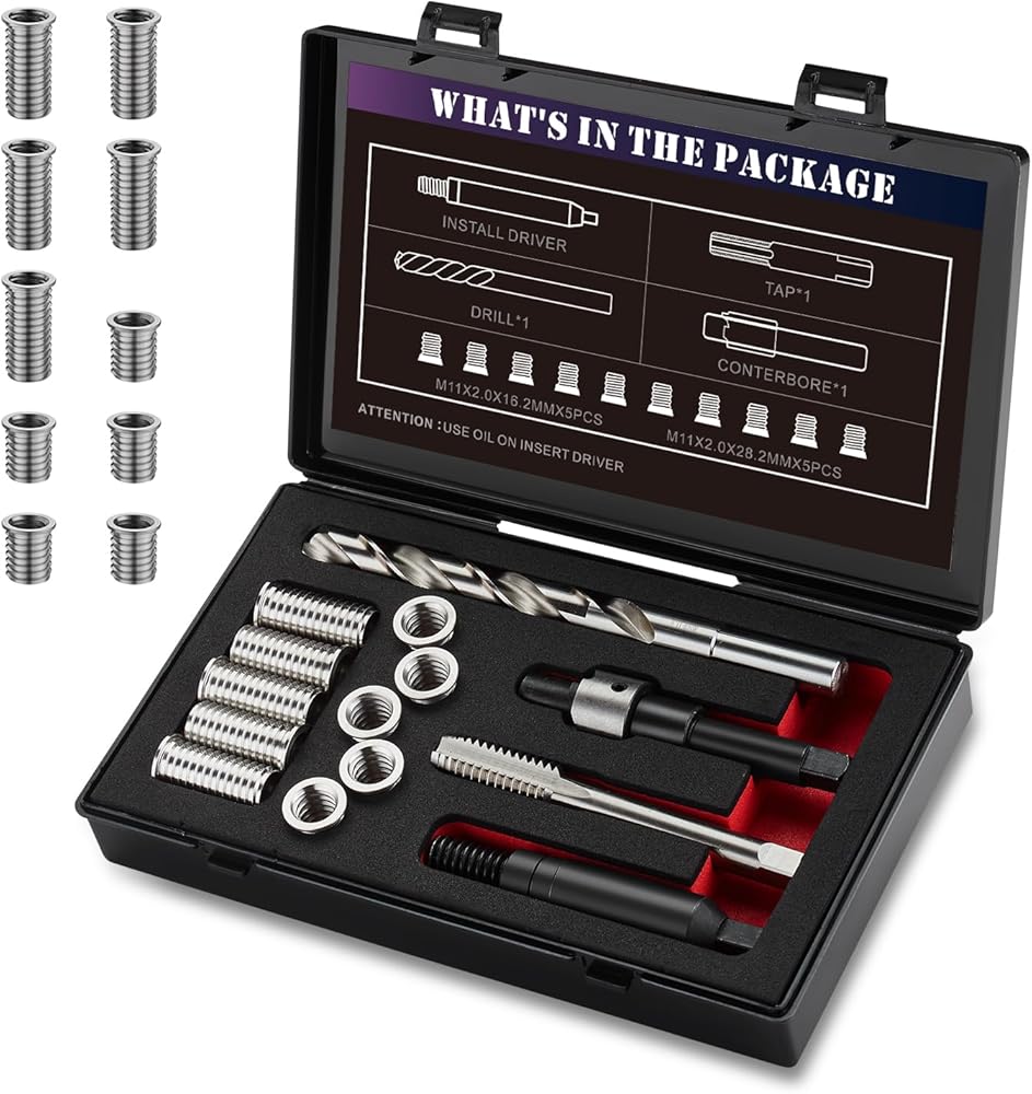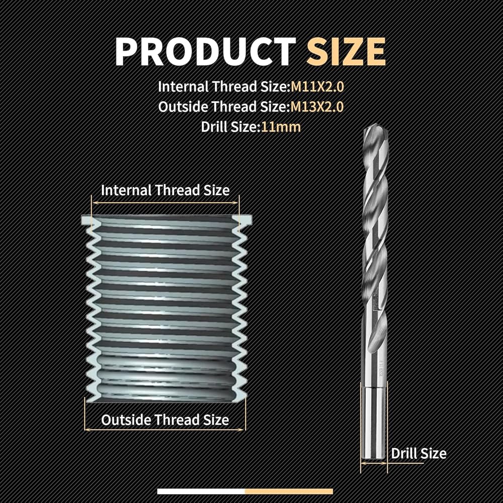 طقم إصلاح الخيوط M11X2.0 مع مثقاب HSS، صنبور، تجويف مضاد، محرك التثبيت، متري، مقاسين من الفولاذ المقاوم للصدأ 5 قطع 16.2 ملم و5 قطع 28.2 ملم
