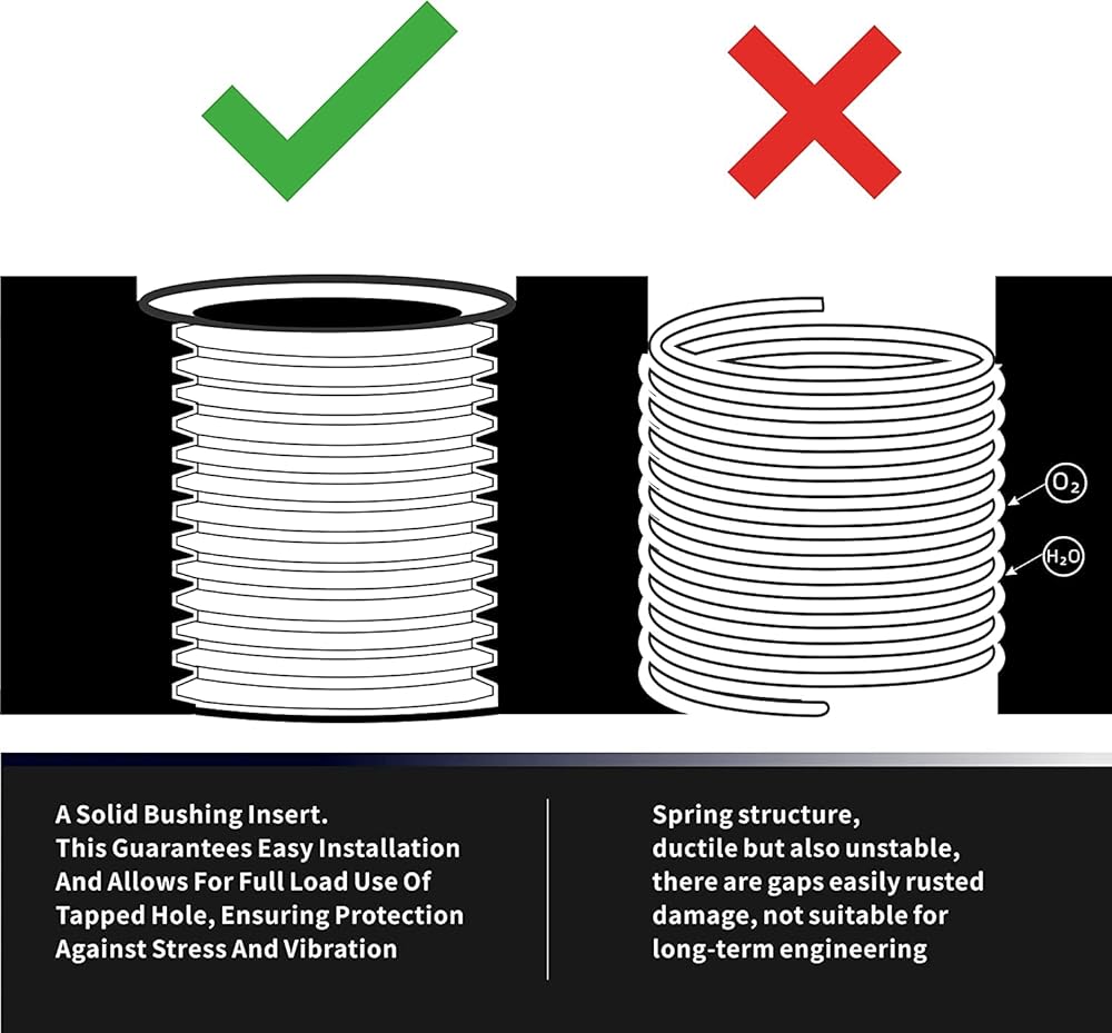 • حشوات متينة من الفولاذ المقاوم للصدأ: حشوة من الفولاذ الصلب تخلق خيطًا داخليًا أقوى وأكثر متانة من الهليكويل.