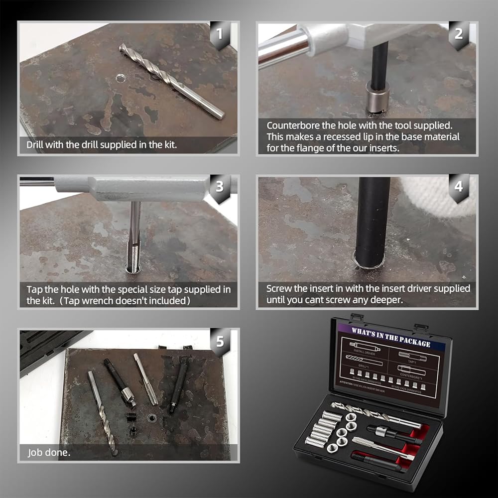 • استعادة الدقة: يتم استخدام مجموعة إصلاح الخيوط الخاصة بنا لإصلاح أو استبدال خيوط المسمار الداخلية التالفة أو المقطوعة. مثالية لمجموعة واسعة من الاستخدامات، هذه المجموعة مناسبة بشكل خاص لإصلاح المحرك وتطبيقات السيارات المختلفة.