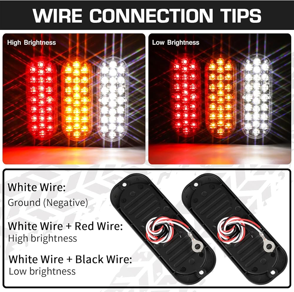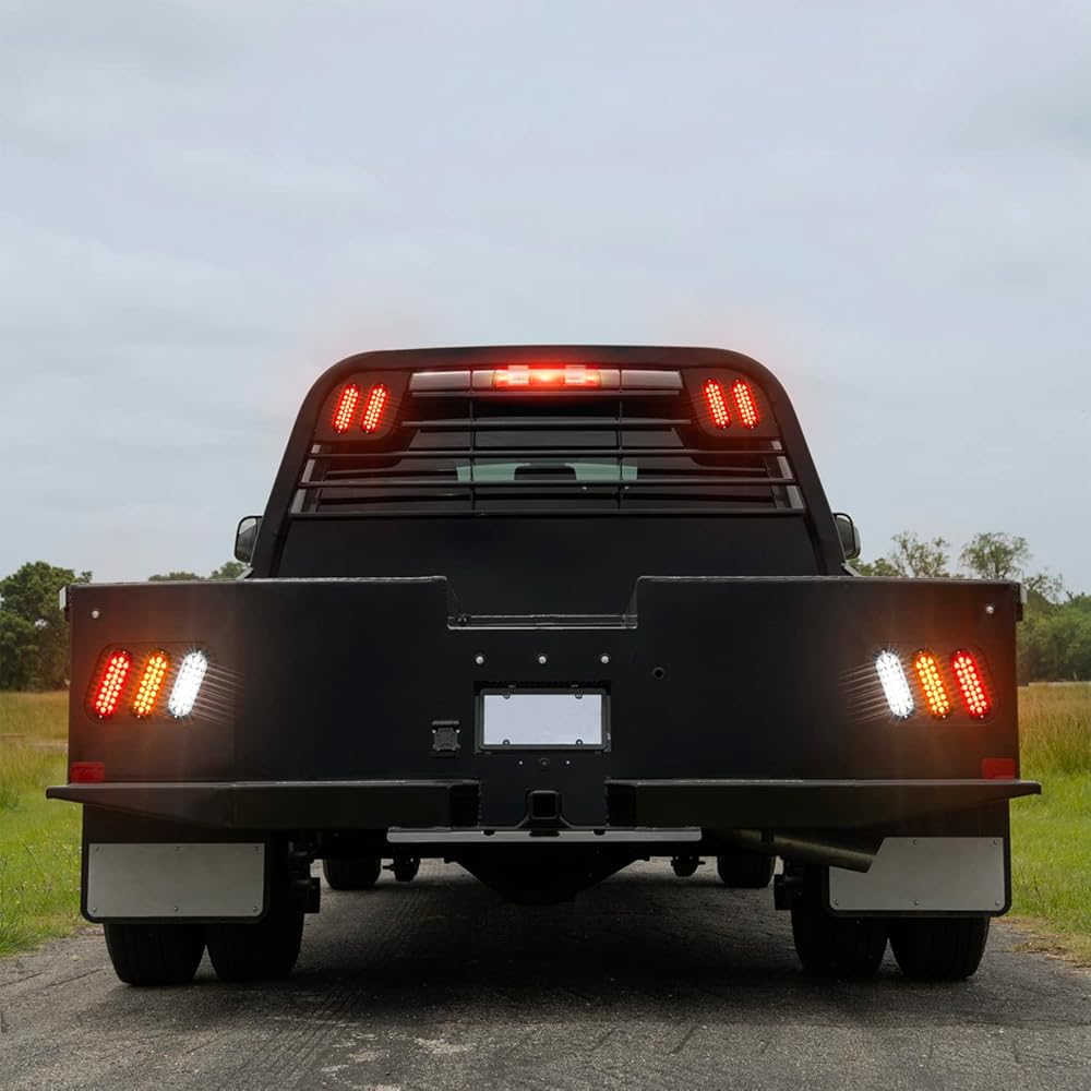الفرامل والانعطاف والضوء الخلفي العكسي: توفر المصابيح الخلفية الحمراء والعنبرية مستويين من الشدة لتعمل كمصابيح خلفية أو مصابيح انعطاف/فرامل. توفر المصابيح الخلفية البيضاء مستويات شدة سحب لتعمل كإضاءة عكسية/احتياطية. مثالية لأي مركبة مزودة بمصدر طاقة تيار مستمر 12-24 فولت، مثل الشاحنة، المقطورة، القارب، الحافلة، الشاحنة، الشاحنة، القافلة، عربة الثلج، إلخ.