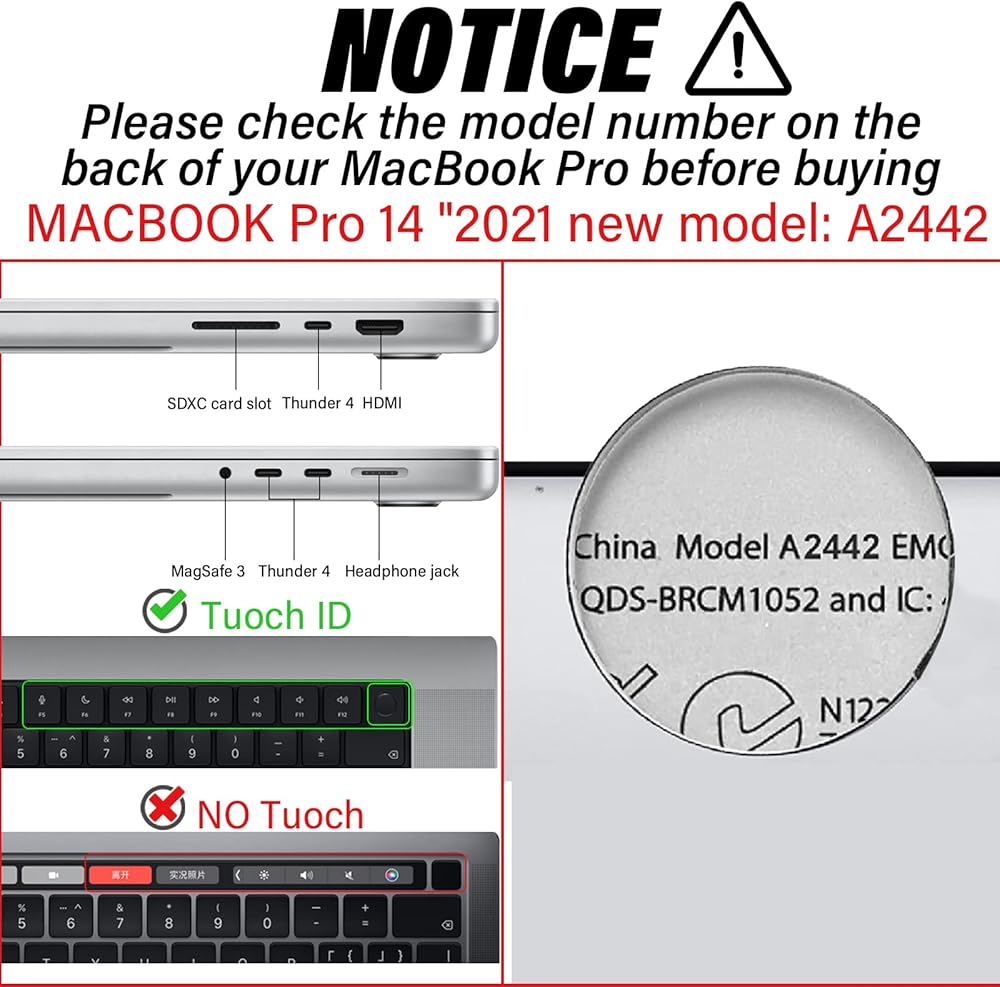 💻【التوافق】 حافظة MacBook Pro مقاس 14 بوصة، موديل 2021 A2442 M1 Pro / M1 Max Chip & Touch ID، الإصدار 2021. يرجى التحقق من رقم الطراز "AXXX" على الجزء الخلفي من جهاز MacBook الخاص بك قبل الشراء