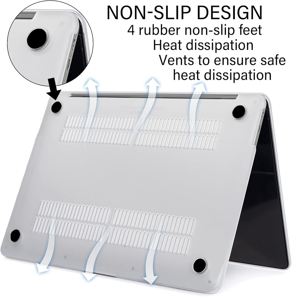 💻【تبديد الحرارة والتبديل】تم تصميم الجزء السفلي من الغطاء بفتحات تهوية لضمان تبديد الحرارة بشكل جيد لجهاز MacBook الخاص بك. يتميز التصميم سهل التركيب والمكون من قطعتين بالإمساك والإزالة، مما يسمح لك بفتح/إغلاق جهاز MacBook الخاص بك بحرية في جميع الأوقات.