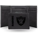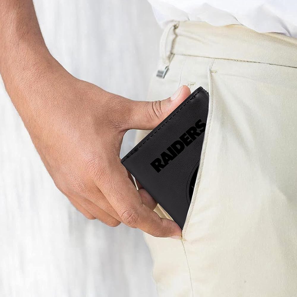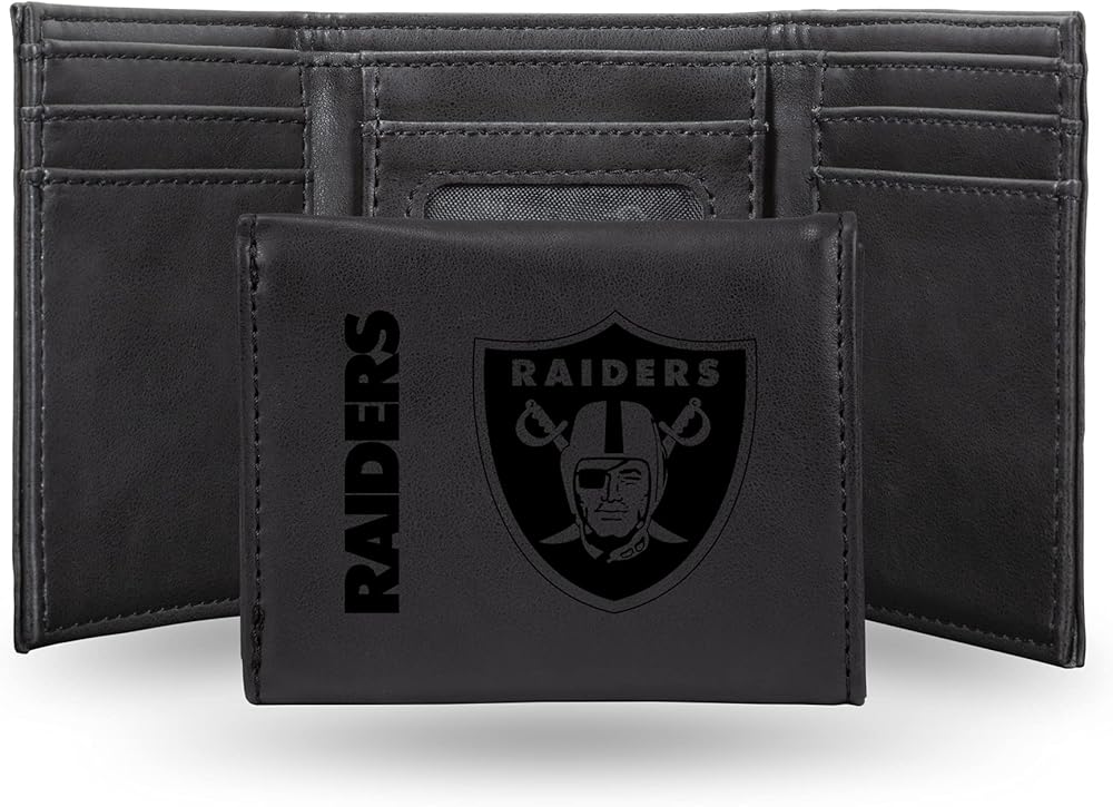 محفظة سوداء ثلاثية الطي للرجال من NFL Las Vegas Raiders - شعار فريق NFL ممتاز منقوش بالليزر على جلد نباتي/صناعي - تصميم بسيط يتضمن نافذة لبطاقة الهوية وحامل بطاقة الائتمان - هدية مثالية للرجال