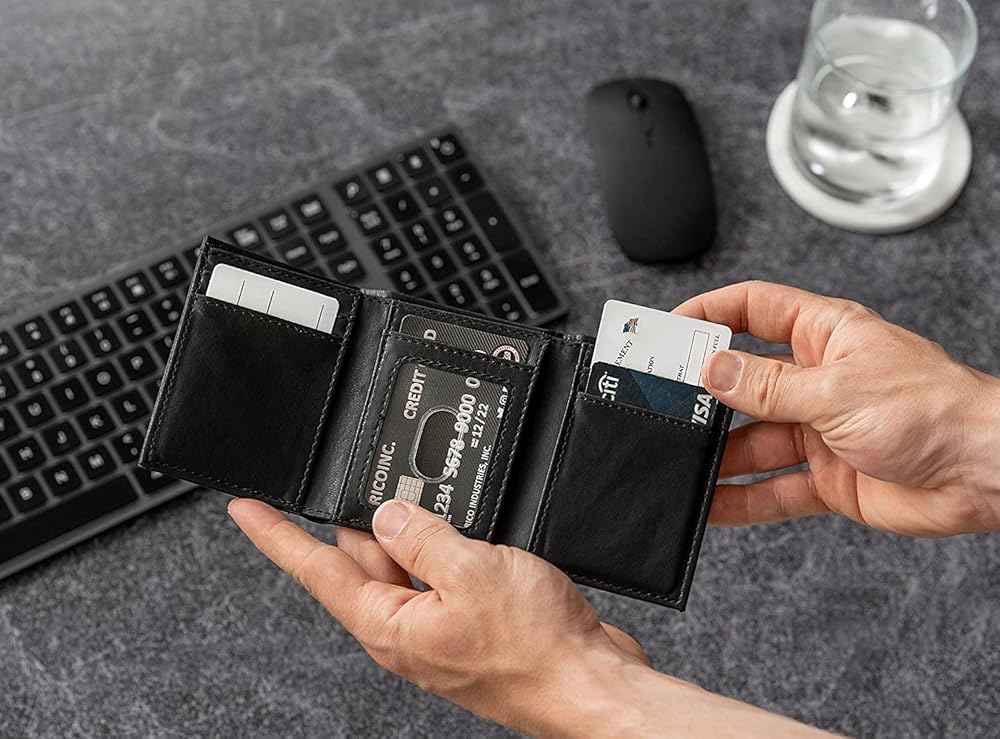 • سعة تخزين آمنة بتصميم نحيف - تحتوي هذه المحفظة ثلاثية الطي على 4 فتحات لحمل بطاقات الائتمان وبطاقات السحب الآلي وبطاقات التأمين على السيارات والتسجيل وبطاقات العمل. تتضمن جيبين مخفيين منزلقين. تتميز فتحة نافذة بطاقة الهوية الشفافة بتصميم فتحة إبهام سهلة الانزلاق.
