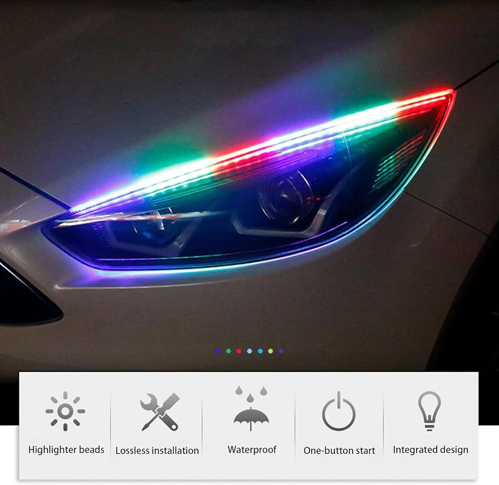 2 قطعة شريط إضاءة LED مرن للسيارة، شريط إضاءة LED متعدد الألوان RGB مقاس 24 بوصة، شريط إضاءة نهاري مقاوم للماء، شريط أنبوبي ضوء نيون أضواء إشارة الانعطاف DRL ضوء خلفي