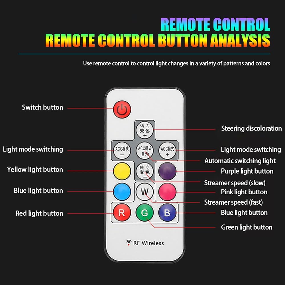 🚚 جهاز التحكم عن بعد: أوضاع وألوان متعددة لاختيارك، بما في ذلك وضع المطاردة. تشغيل/إيقاف، تغيير اللون، تغيير نمط الوميض، تغيير سرعة الوميض، السطوع، الألوان وما إلى ذلك.