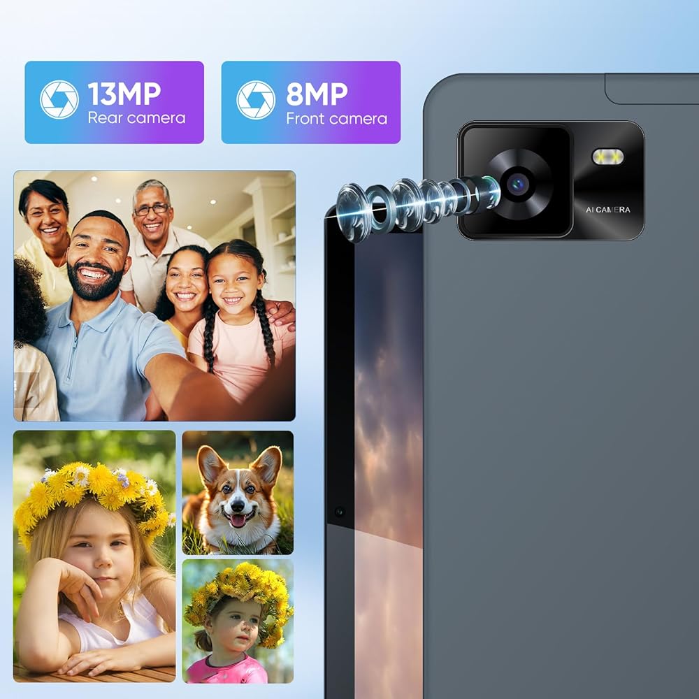 • 🌈【شاشة عالية الدقة مقاس 10.1 بوصة وكاميرا مزدوجة】 جهاز Android اللوحي المزود بشاشة عالية الدقة 1280*800 IPS مقاس 10 بوصة عالية الدقة، ستمنحك جميع شاشات اللمس الزجاجية G+G تجربة لمس أسرع وأكثر سلاسة. مع كاميرا بدقة 8 ميجابكسل + 5 ميجابكسل عالية الدقة، يمكنك التقاط صور عالية الدقة وإنشاء مقاطع فيديو مع العائلة والأصدقاء.