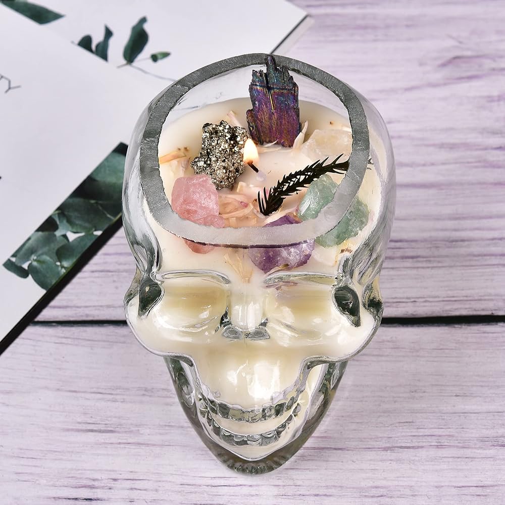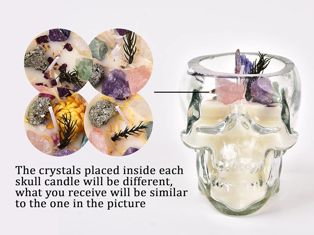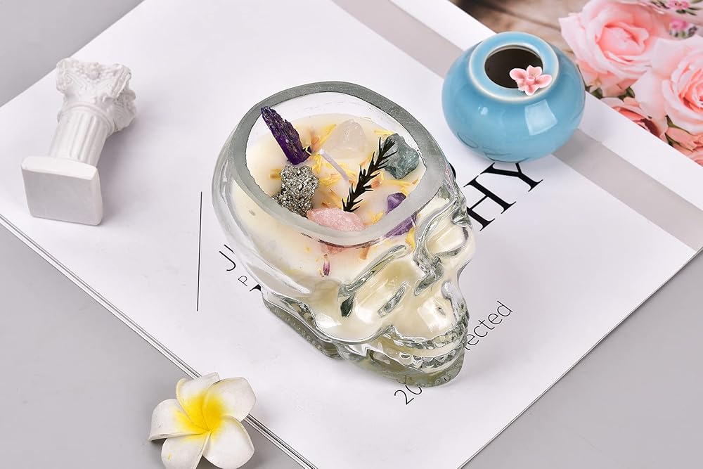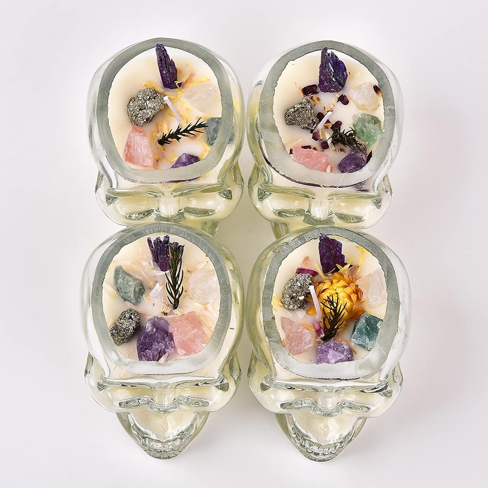 الشموع المصنوعة يدويًا: شمعة الجمجمة هذه مصنوعة يدويًا بالكامل. يتم وضع أحجار كريمة طبيعية مختلفة على الشموع، ويتم تزيين الزهور المجففة وتعطيرها، وكل شمعة على شكل جمجمة فريدة من نوعها.
