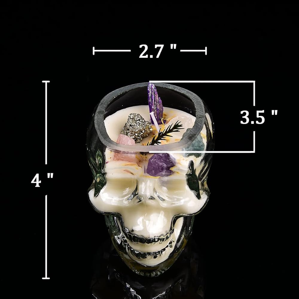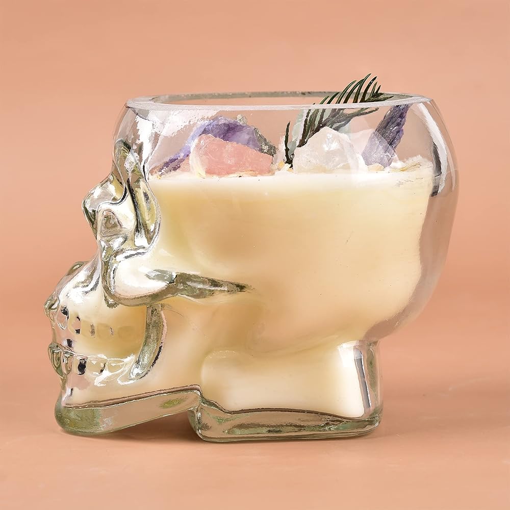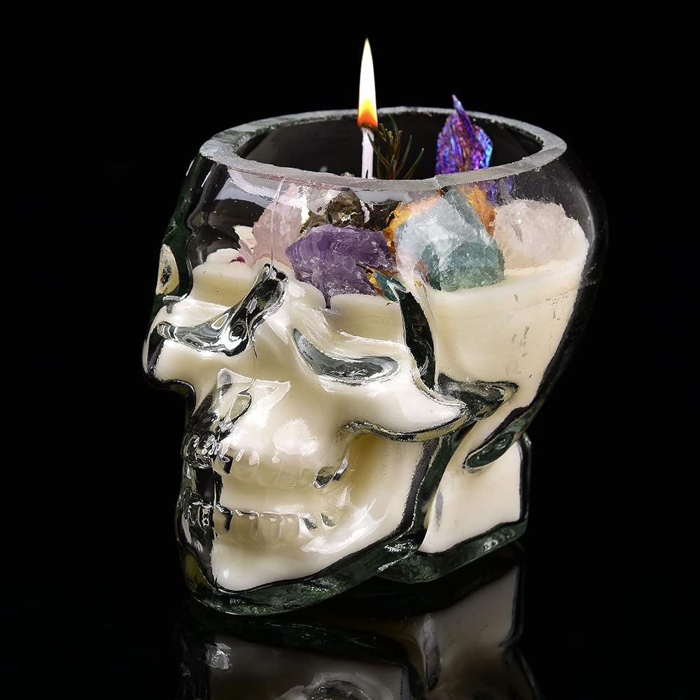 الشموع المصنوعة يدويًا: شمعة الجمجمة هذه مصنوعة يدويًا بالكامل. يتم وضع أحجار كريمة طبيعية مختلفة على الشموع، ويتم تزيين الزهور المجففة وتعطيرها، وكل شمعة على شكل جمجمة فريدة من نوعها.