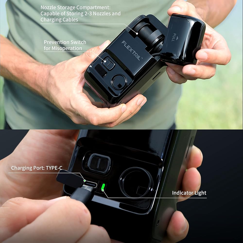 【قفل السفر وحجرة التخزين】: زر قفل السفر يمنع التنشيط العرضي للمفتاح، مما يعزز السلامة. يمكن لحجرة التخزين المدمجة استيعاب 2-3 فوهات أو كابلات شحن، مما يضمن سهولة التنظيم أثناء النقل أو الاستخدام دون القلق بشأن فقدان الملحقات.
