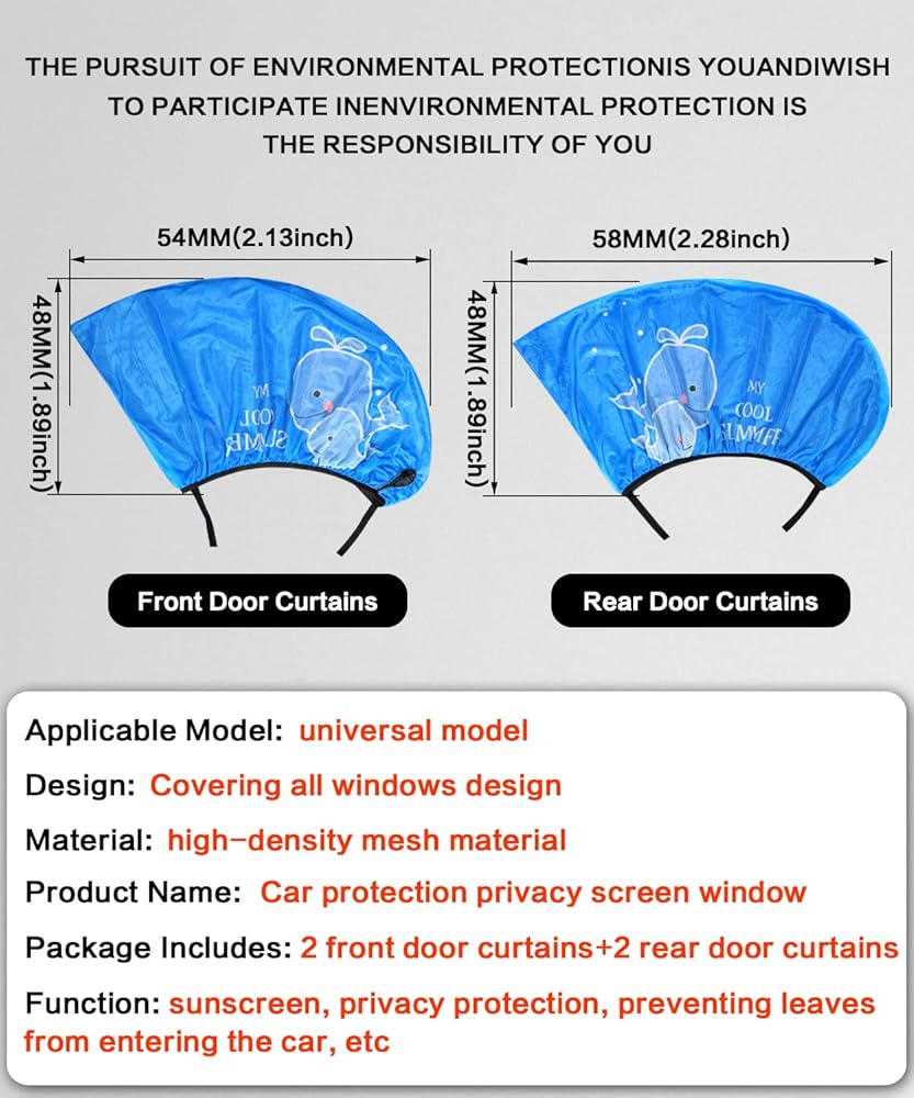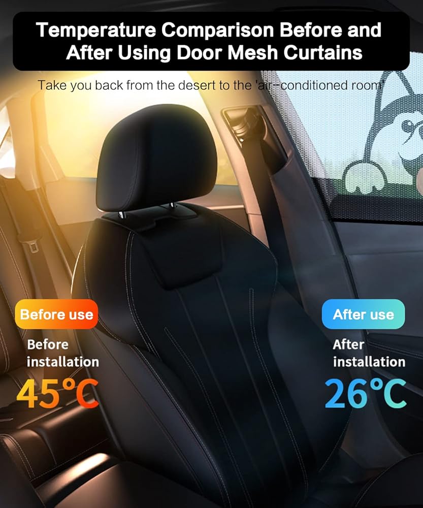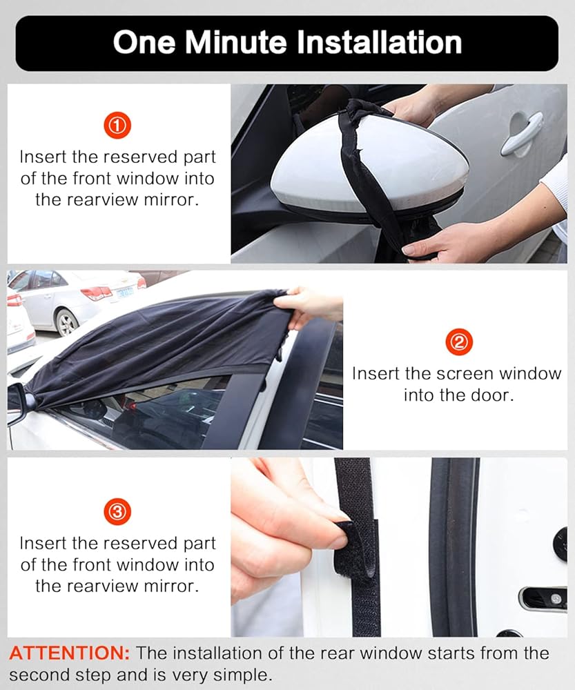 【مظلة شمسية لنافذة السيارة متعددة الوظائف】-- مظلات شمسية ذات طبقة شبكية مزدوجة عالية الجودة تمنع الكثير من أشعة الشمس، وتخفض درجة الحرارة في السيارة، وتبطئ عملية الشيخوخة الداخلية لسيارتك؛ يمكنه منع البعوض أو أوراق الشجر من دخول السيارة بشكل فعال؛ ويمكنه أيضًا حماية خصوصية الأفراد داخل السيارة إلى حد ما.