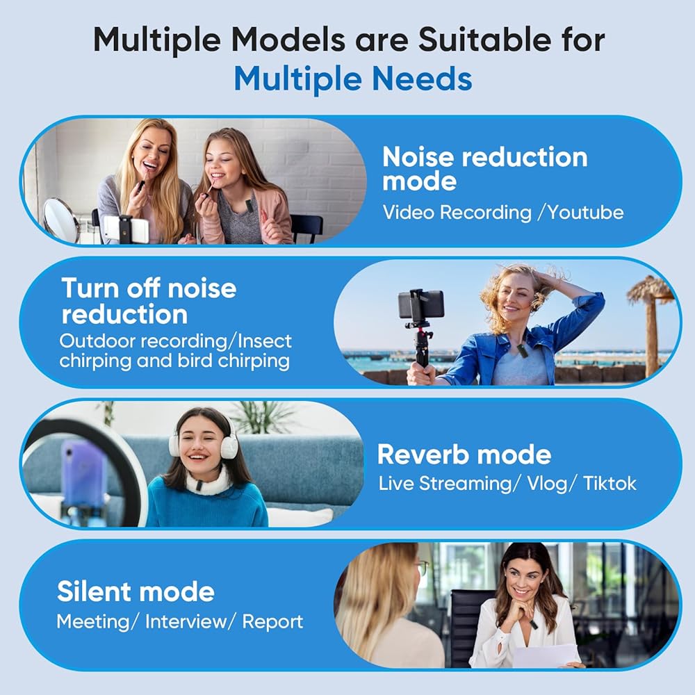 4 أوضاع تسجيل: وضع عكسي للميكروفون المشبك، ووضع تشغيل/إيقاف تقليل الضوضاء، ووضع صامت. يمكن تعديل الأوضاع الأربعة بسهولة وفقًا لاحتياجاتك.