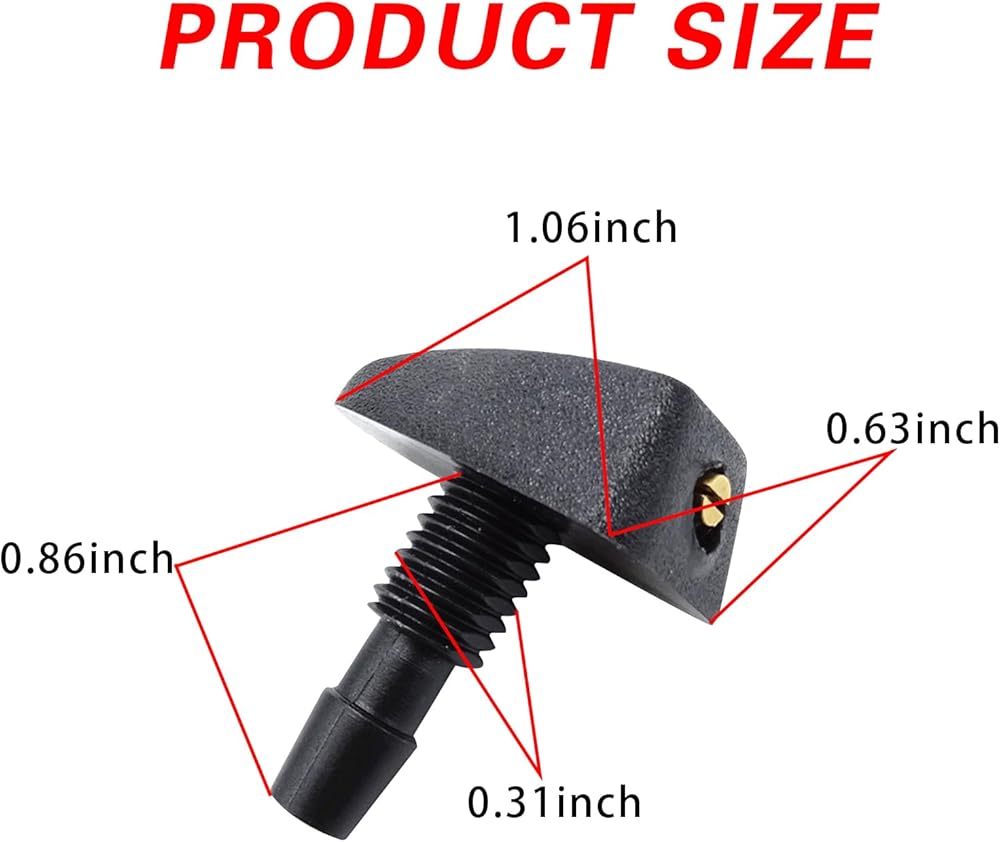 Product Specifications: Package includes 2 x wiper nozzles with head dimensions of 1.06" x 0.62", stem length 0.86", and thread diameter 0.31". Fits most car wiper nozzles. You can confirm the tube diameter before ordering to ensure a good fit.