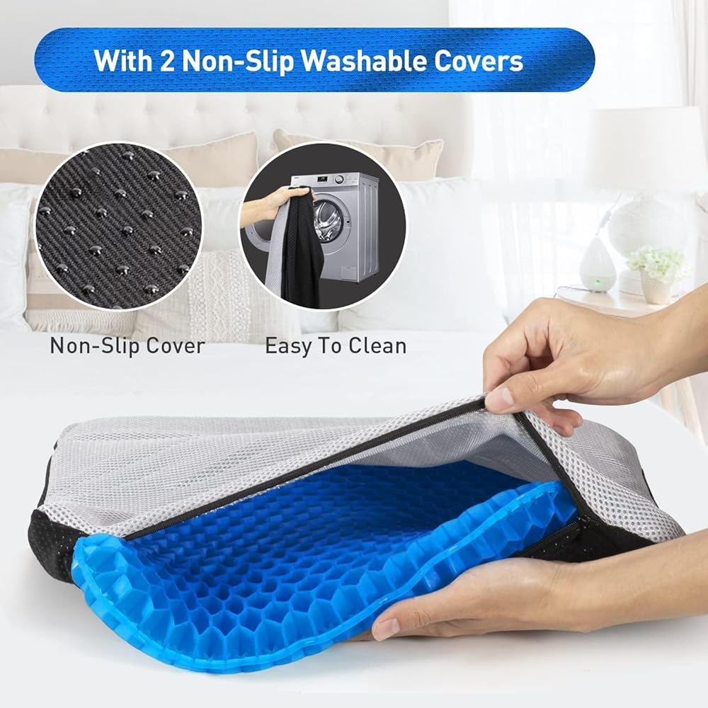 كما هو موضح في الصورة الرئيسية، تأتي وسادة المقعد الخاصة بنا مع غطاءين مطورين وقابلين للغسل. تم تصميم الأغطية بسحاب ناعم، مما يسهل إزالة الوسادة المطاطية الداخلية، والتي يمكن تنظيفها بشكل أفضل دون القلق بشأن تلويث المقعد. ووسادة الجل الخاصة بنا تختلف عن وسادة المقعد المصنوعة من الإسفنج الذي يتشكل حسب الجسم الملامس. يمكن غسلها مباشرة بالماء وتهويتها بسرعة لتجف، وهي مريحة للتخزين.