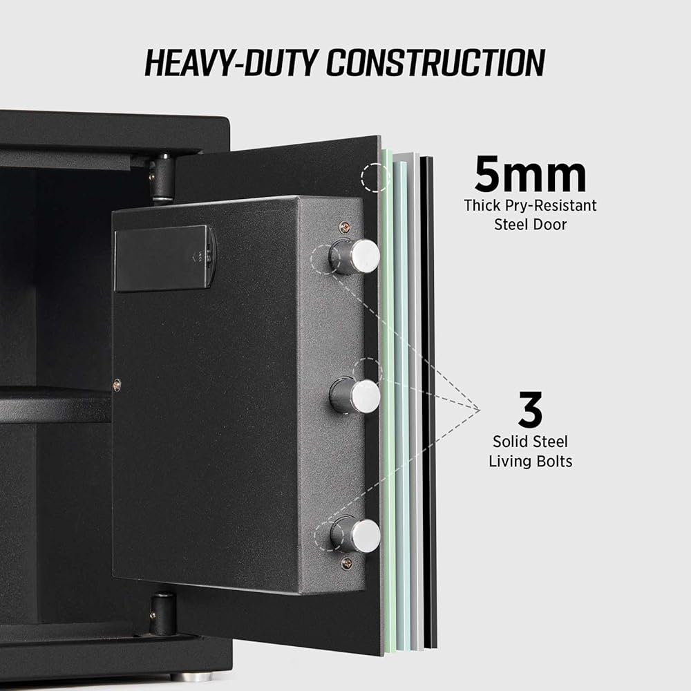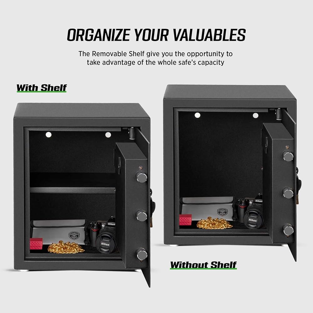 【رف قابل للإزالة وسبائك فولاذية】تتميز خزنة المنزل برف قابل للإزالة لسهولة تنظيم الأشياء الثمينة بالداخل. صندوق القفل مصنوع من سبائك الصلب المقوى، ومزالج الأسطوانة المزدوجة تزيد من السلامة والموثوقية. توفير الحماية الجسدية ضد الدخول القسري.