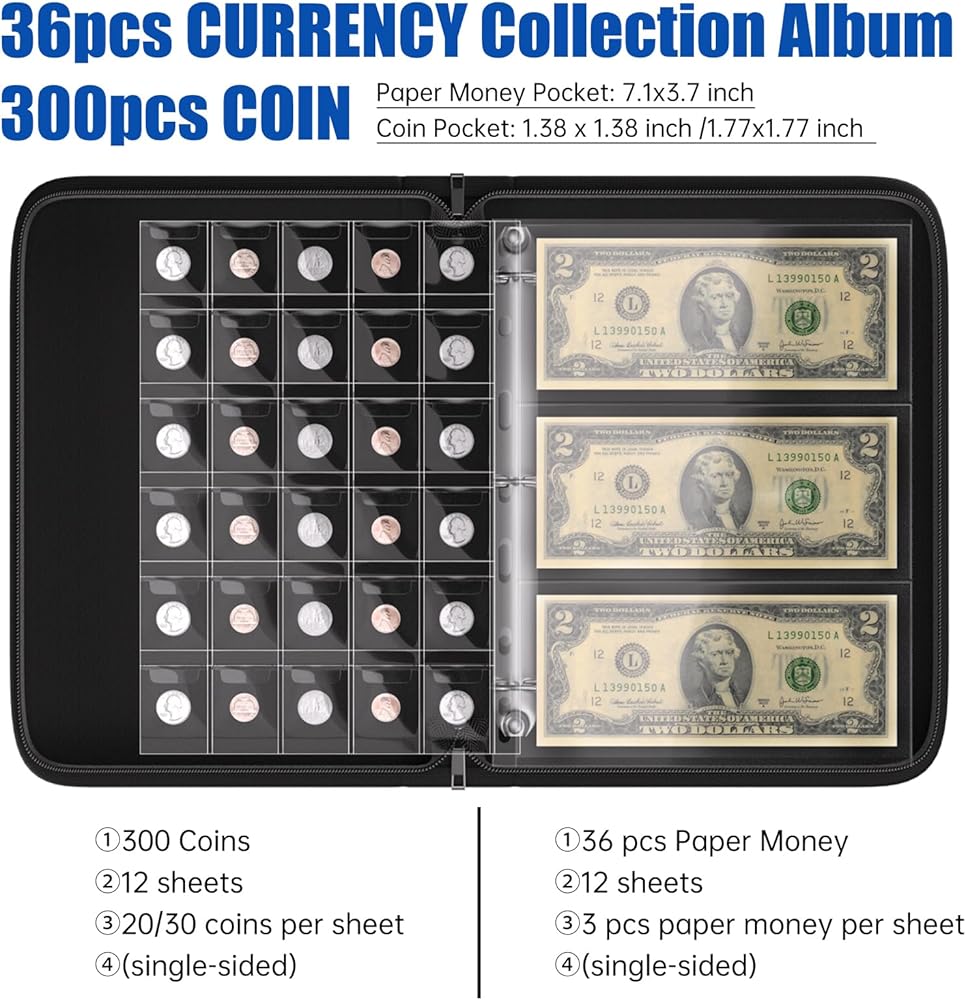 سعة كبيرة تحمل 300 عملة معدنية: الجيوب متوفرة بمقاسين: ①1.38x1.38 بوصة: 30 جيبًا لكل صفحة بإجمالي 6 صفحات، ②1.77x1.77 بوصة: 20 جيبًا لكل صفحة بإجمالي 6 صفحات. يحتوي كتاب العملات المعدنية على دولارات فضية وأرباع ونصف دولار وعملات دولار وعملات تحدي والمزيد من العملات المعدنية (حتى 45 ملم). حامل مجموعة العملات المعدنية مناسب ليس فقط لهواة الجمع المحترفين ولكن أيضًا للأطفال والمبتدئين.