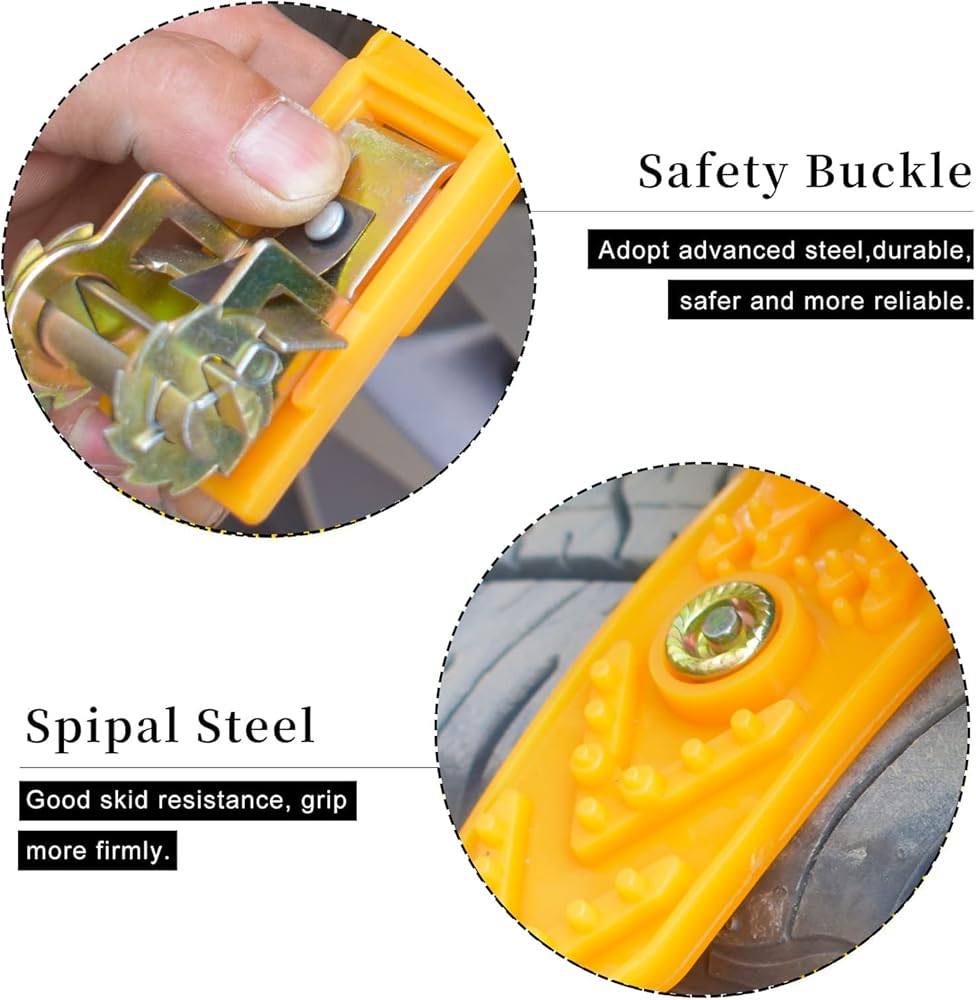 مادة ممتازة: سلسلة إطارات الثلج المطورة مصنوعة من مادة البولي يوريثين، مقاومة لدرجة الحرارة المنخفضة -50 درجة فهرنهايت. يتم إخماد وتقوية المرابط ذات الصف المزدوج لمقاومة التآكل القوية. يستخدم حزام النايلون مادة مستوردة، والتي تتميز بمقاومة قوية للتآكل، وقوة شد عالية وليس من السهل كسرها. كما أن مشبك التثبيت المصنوع من السبائك لا يحتك بمحور الإطار.