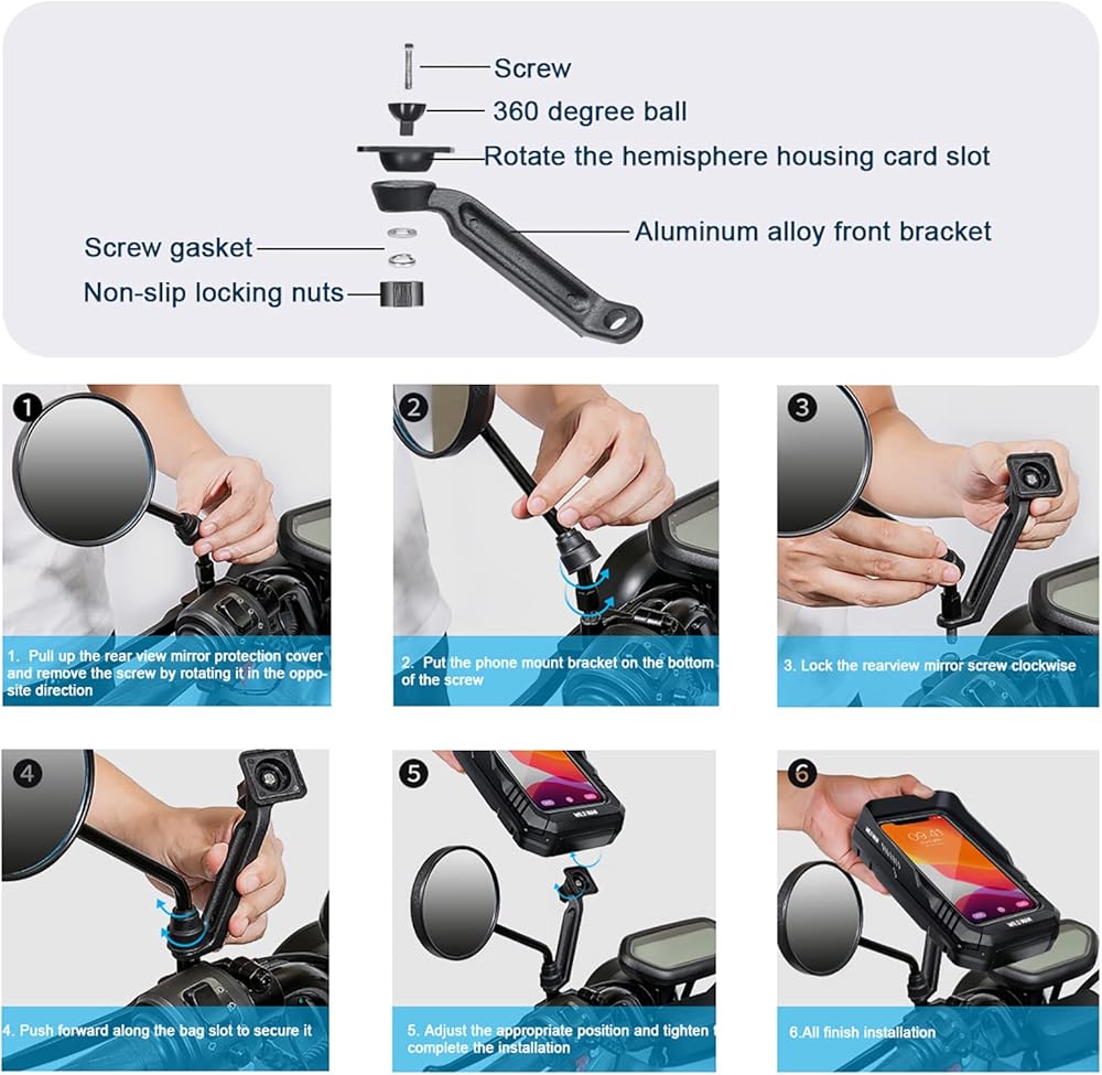 ➤ كيفية التثبيت، ضع فتحات الأنابيب المستديرة للدعامة المرفقة بإطار الرؤية الخلفية، إذا كنت بحاجة إلى إزالة حامل هاتف الدراجة النارية، يمكنك إزالته بنقرة واحدة فقط