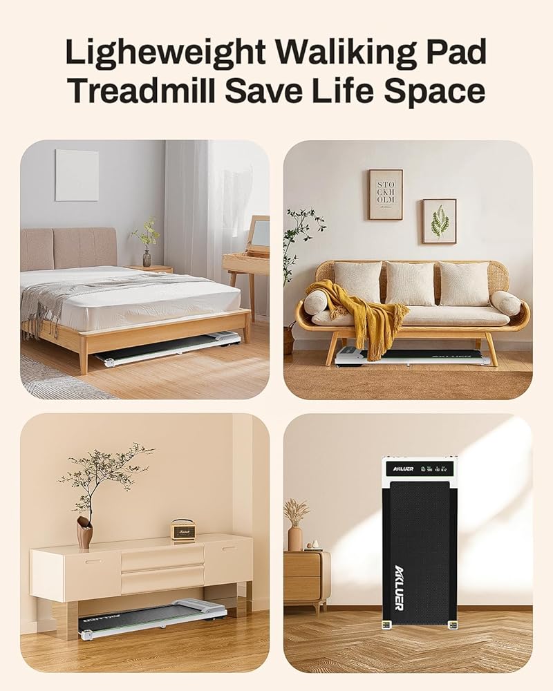 توفير المساحة والتركيب مجانًا: تتميز جهاز المشي Akluer بأبعاد 52.4 × 24.8 × 5.7 بوصة، وهي خالية من التركيب ومناسبة لجميع أفراد الأسرة لاستخدامها في التمارين في المنزل/المكتب. يمكن نقل جهاز المشي المصمم بعجلات مدمجة بسهولة إلى الموضع الذي تريده ويسمح بتخزينه بسهولة تحت الأريكة أو السرير أو وضعه على الحائط لتوفير المساحة الخاصة بك.