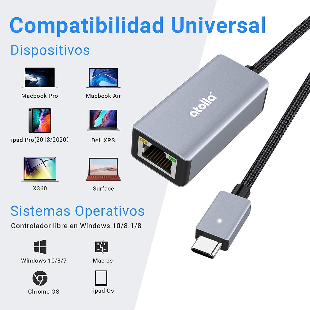 محول USB C إلى إيثرنت: تجهيز الكمبيوتر المحمول USB-C الخاص بك بمنفذ RJ-45 Ethernet، يمكن أن يوفر محول أتولا USB-C إلى إيثرنت شبكات أفضل بسرعة وقدرة على التحمل من أي اتصال لاسلكي غير مستقر وعرضة للمشاكل.