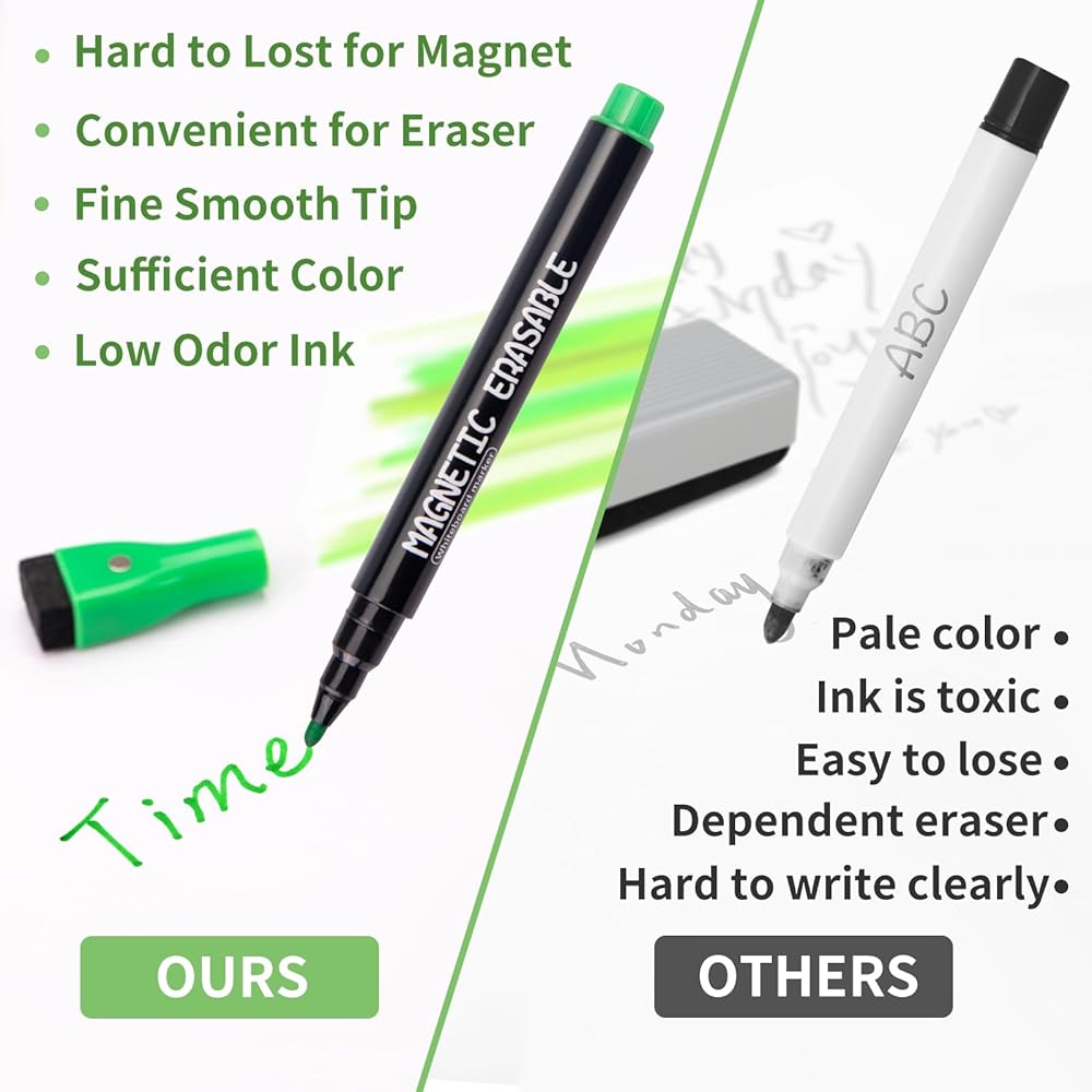 【عبوة قيمة】تحتوي هذه المجموعة على 12 قطعة من أقلام التحديد الرقيقة الممحاة الجافة المغناطيسية الملونة. عبوة الأقلام سهلة الحمل والتخزين وإعادة الاستخدام.