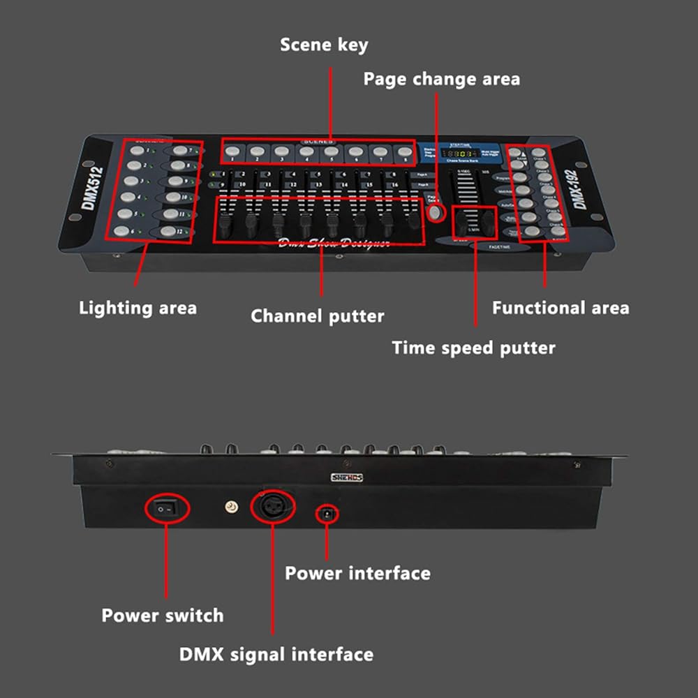【سهلة التشغيل】تتضمن وحدة التحكم Dmx منطقة الإضاءة، ومضرب القناة، ومضرب سرعة الوقت، والمنطقة الوظيفية، ومفتاح Scen، ومنطقة تغيير الصفحة، وشاشة LCD. مما يسهل برمجته والتبديل بين التأثيرات والمشاهد المختلفة.