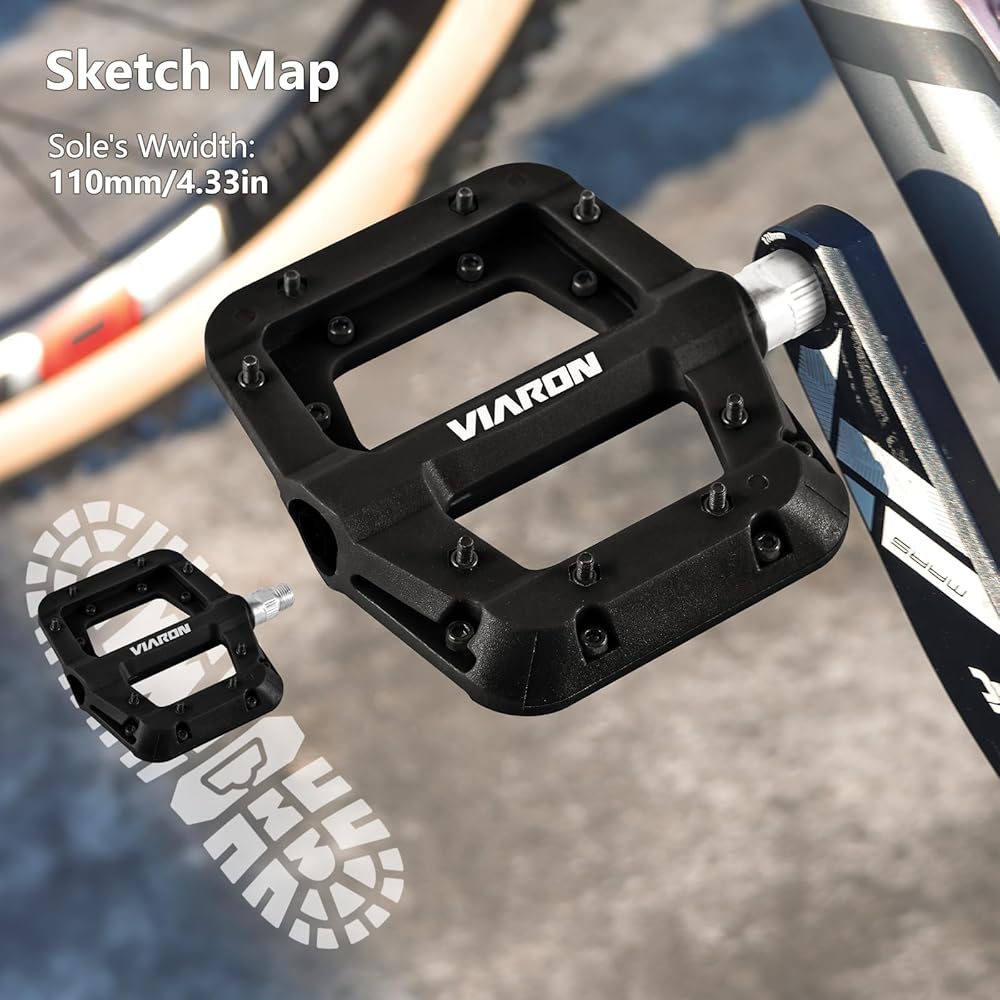 منصة أوسع وخفيفة الوزن: عرض 4.53 بوصة وطول 5.12 بوصة (طول × عرض) ستوفر دواسات الدراجة ذات المنصة الكبيرة جدًا مزيدًا من الأمان على الدواسات وتثبت قدميك في مكانها. فقط 0.75 رطل/زوج (340 جم). الدواسات خفيفة الوزن ستوفر طاقتك أثناء الركوب.