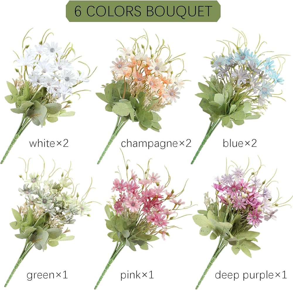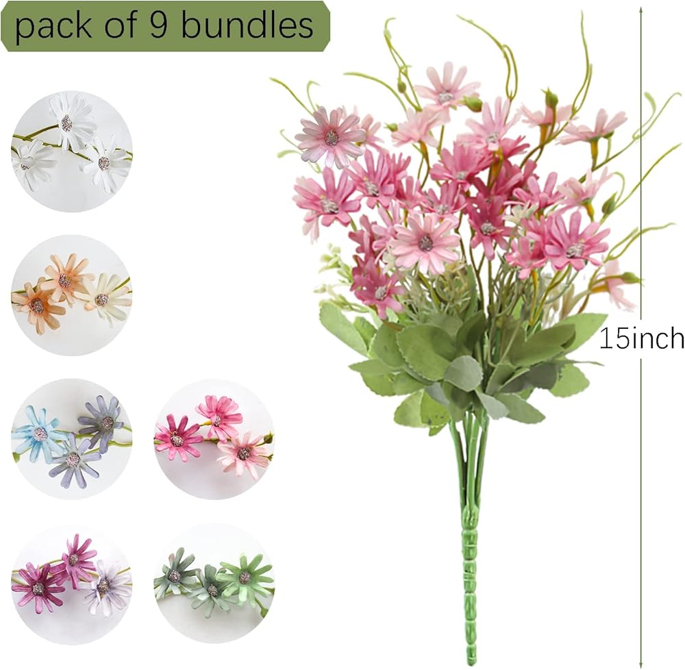 [المقاس]: عبوة مكونة من 9 قطع من زهور الأقحوان المزيفة، كل حزمة مكونة من 6 سيقان، الطول 15.2 سم، قطر رأس الزهور 1.58 سم. مثالي لمعظم المزهريات أو السلال وأفضل حجم لباقة الزفاف.