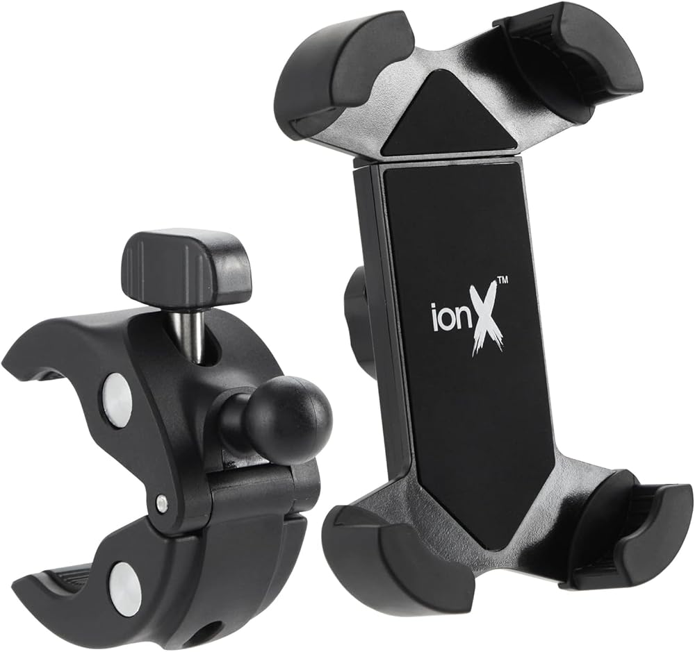 Keep your phone visible and usable while mountain biking, exercising, and riding around town using this bike cell phone holder handlebar mount. It can be securely mounted to any round handlebar or other round pole between 0.7-1.25 inches (18-32 mm) in diameter, making it suitable for almost any bicycle, motorcycle, or ATV, or a vertical support bar on a UTV or other vehicle. It is compatible with iPhone Series 14, 13, 12, 11, SE (2nd gen), XS Max, XS, XR, X, as well as all Samsung Galaxy phones, including S22, S21, S20, S10, and other phones with phone sizes from 4-7 inches and up to 0.68 inches (17mm) thick, allowing it to be used with most protective cases. The ball joint allows you to freely rotate your phone up to 360 degrees for landscape and portrait orientation, and to adjust the vertical and horizontal angles for the optimal viewing angle. Mount this bicycle phone mount to your bicycle or motorcycle handlebars for ready access to the GPS mapping system, mount it to your shopping cart for easy access to your shopping list at the grocery store, or mount it to your child's stroller handle to listen to your favorite podcasts on your afternoon walk. This bike phone holder is sure to become your next favorite item in your bike accessories collection. ionX is a trademark or registered trademark of Juvo Plus, Inc. All other marks shown are owned by their respective owners.