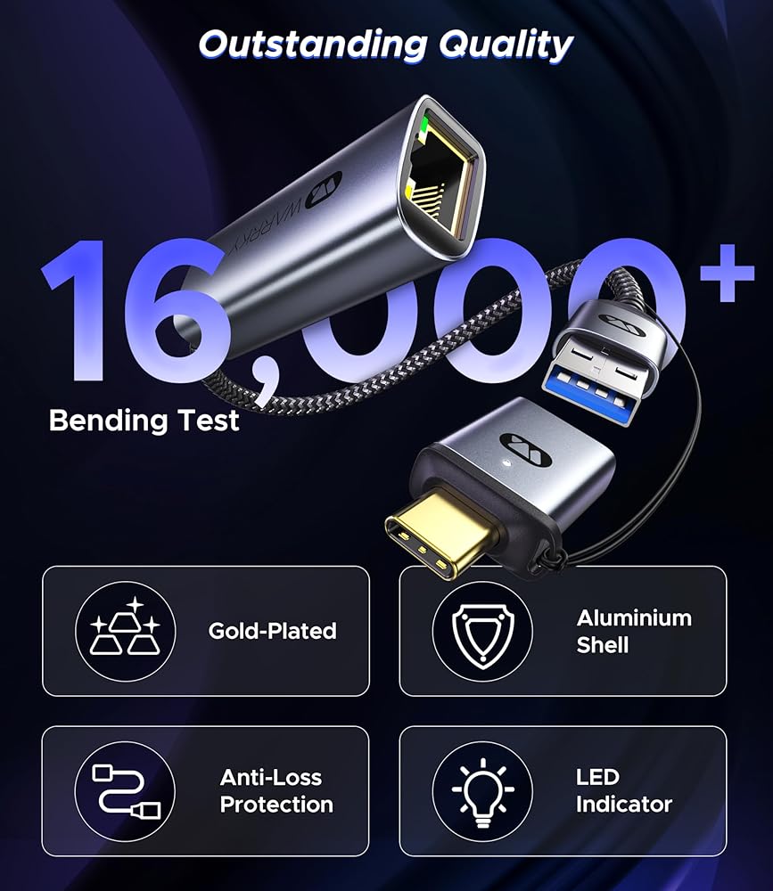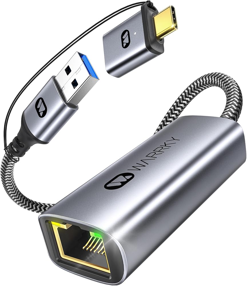 محول USB إلى إيثرنت، محول USB إلى إيثرنت بسرعة 1 جيجابت في الثانية، [مطلي بالذهب] WARRKY 2 في 1 USB 3.0 ومحول USB-C إلى إيثرنت، متوافق مع Mac وiPad Pro وiPhone 15 وXPS وWindows وLinux وSwitch ، مي بوكس