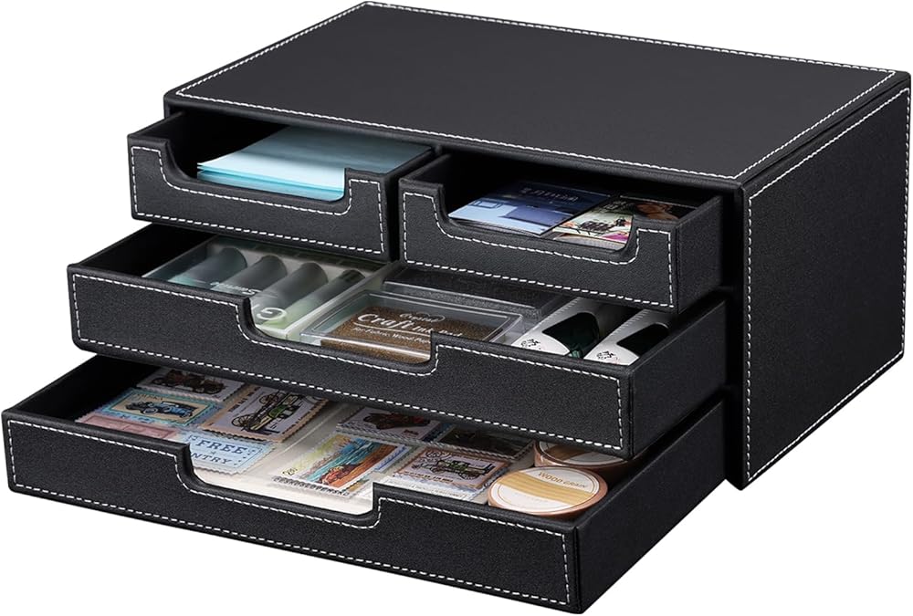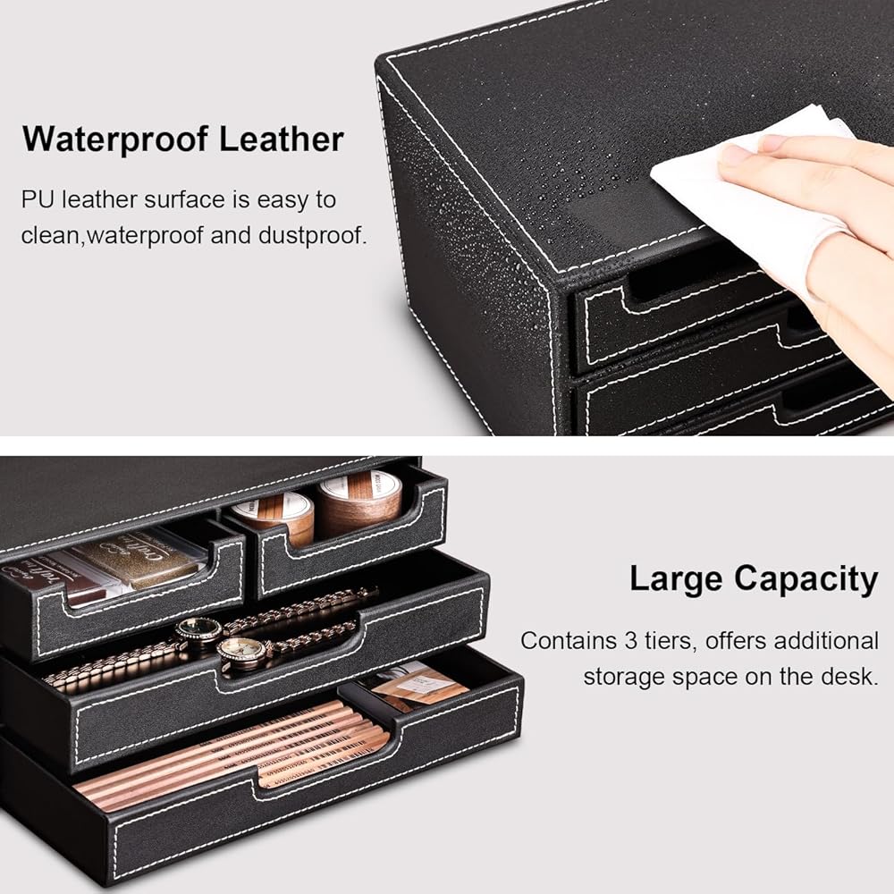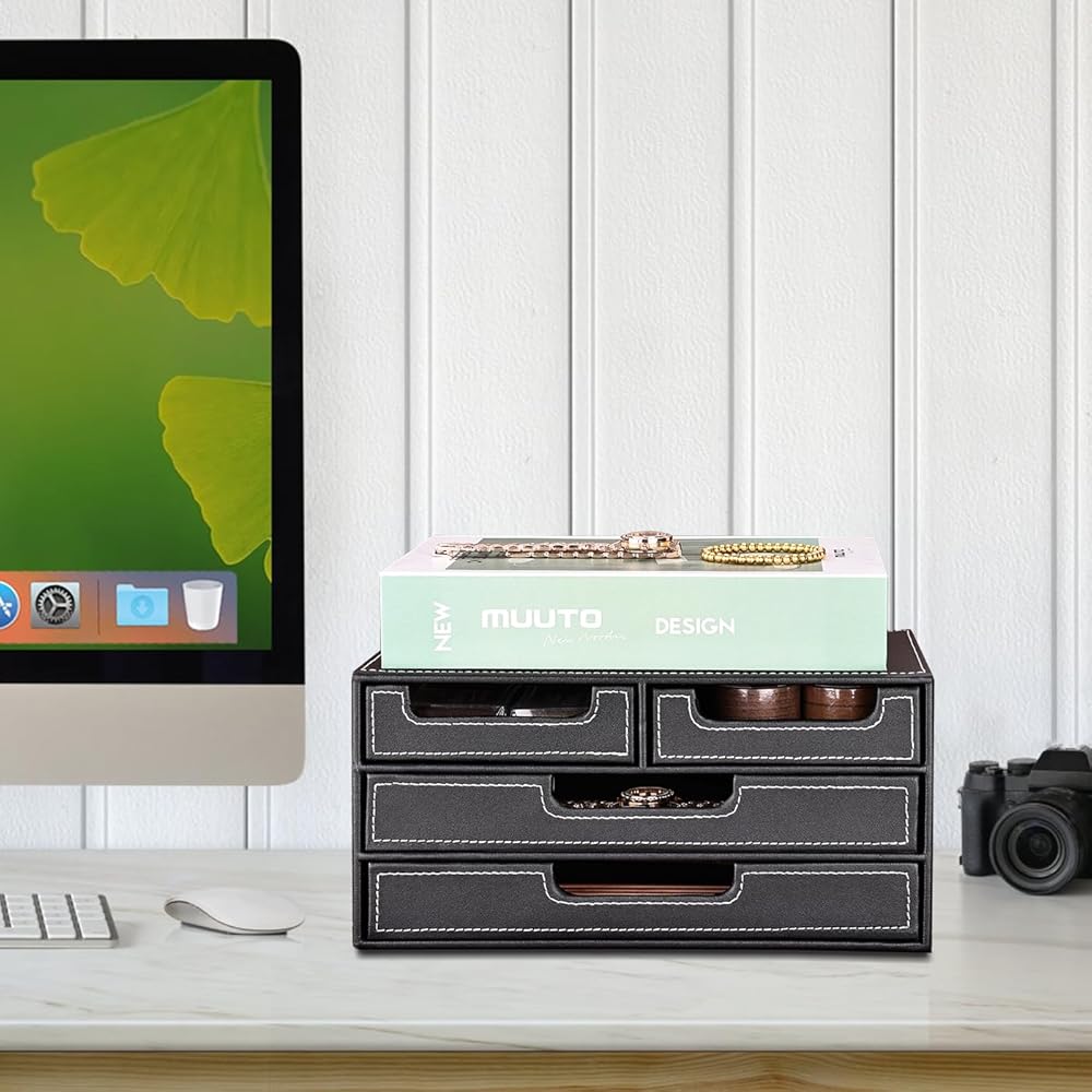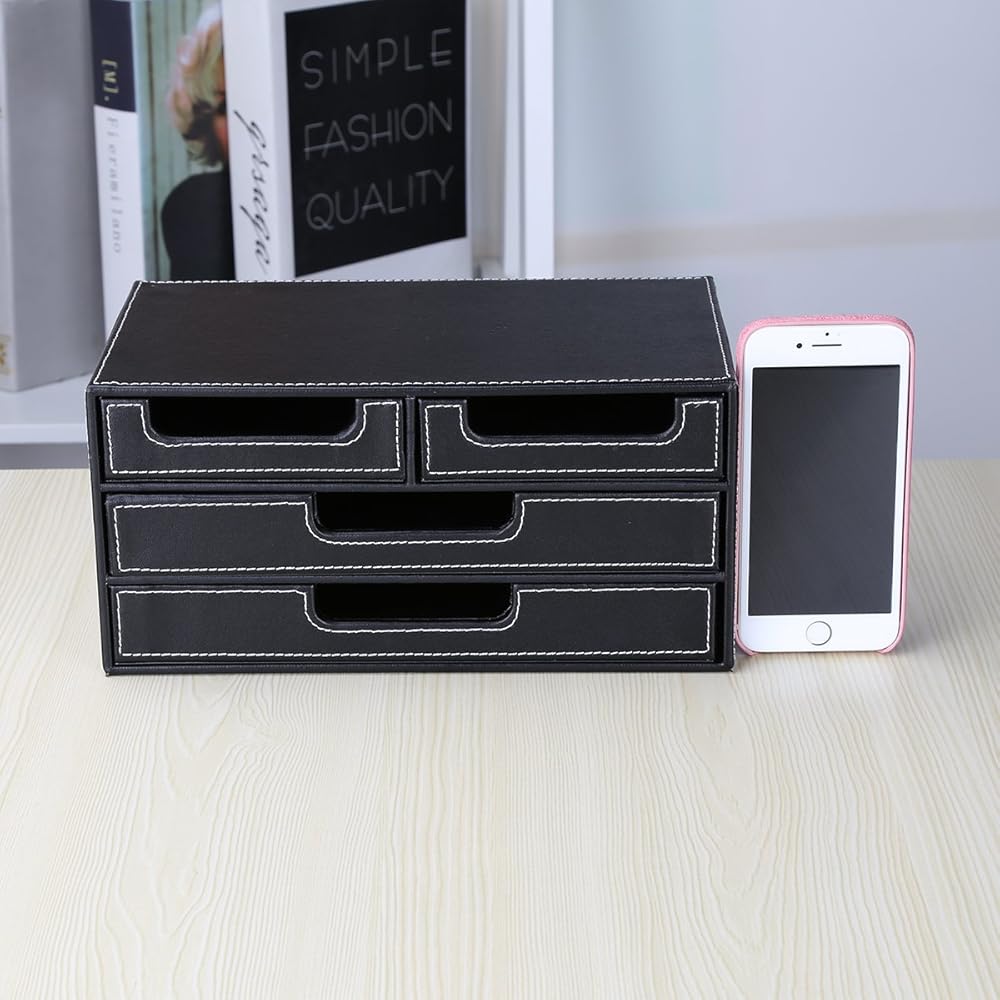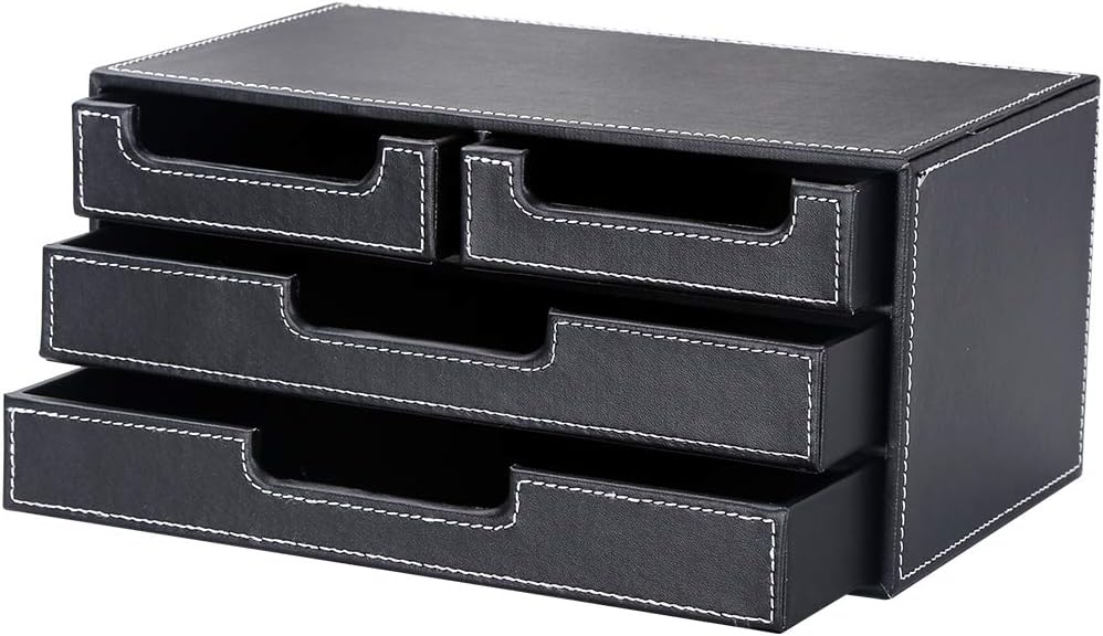 منظم مكتب من الجلد الصناعي من KINGFOM مع 4 أدراج صغيرة، درج منظم لسطح المكتب لملحقات اللوازم المكتبية، صندوق تخزين القرطاسية، حامل مجموعة الفواتير باللون الأسود