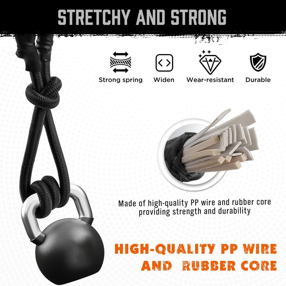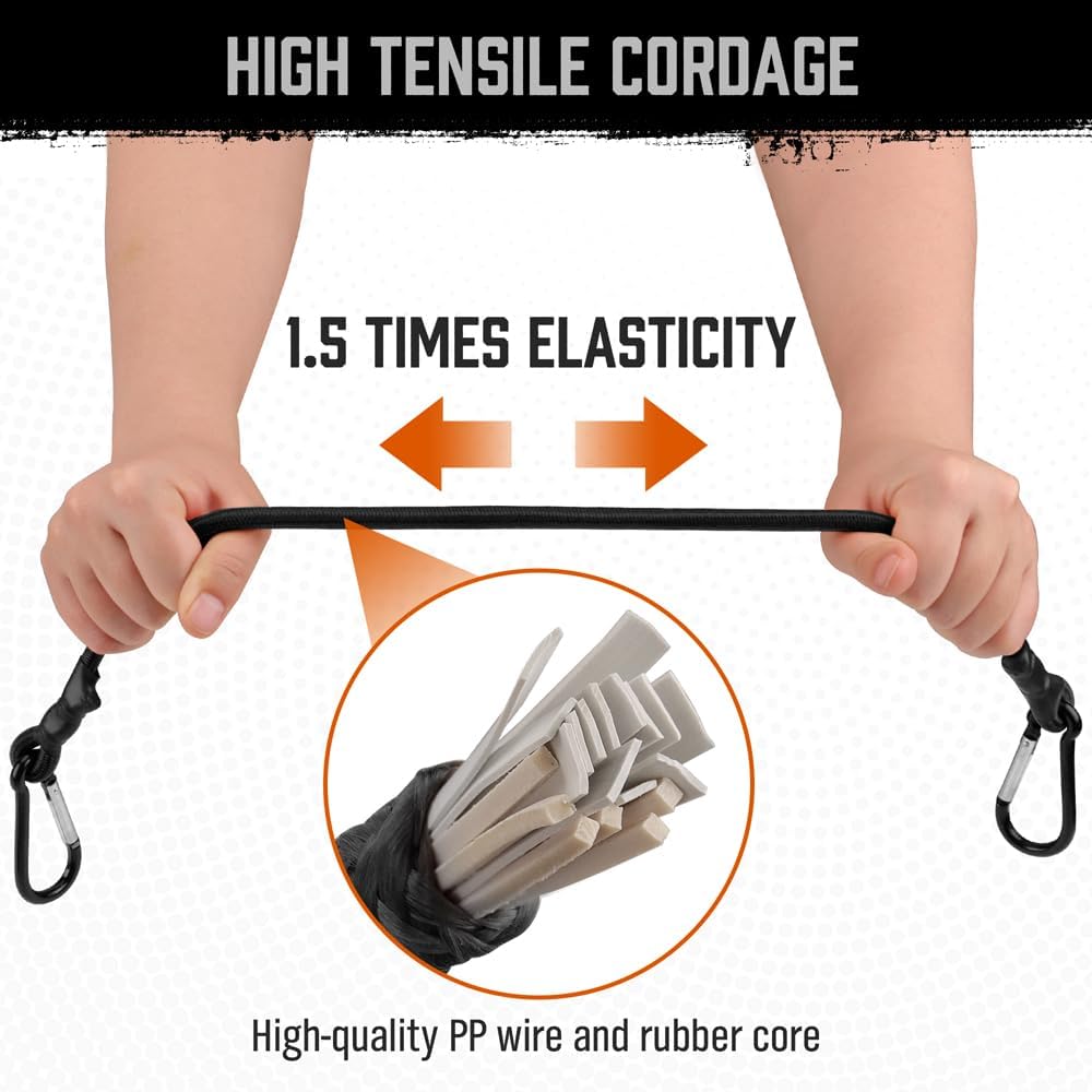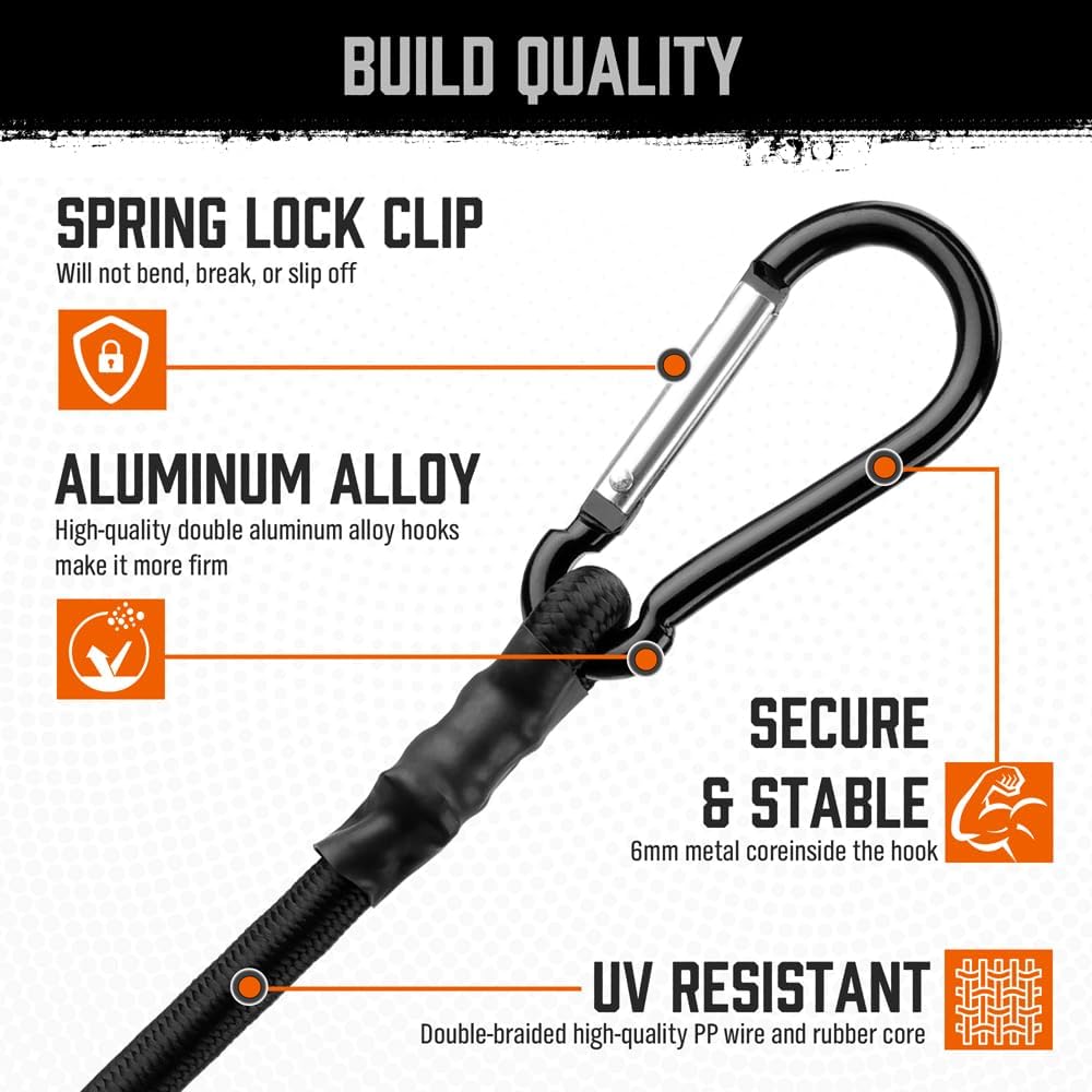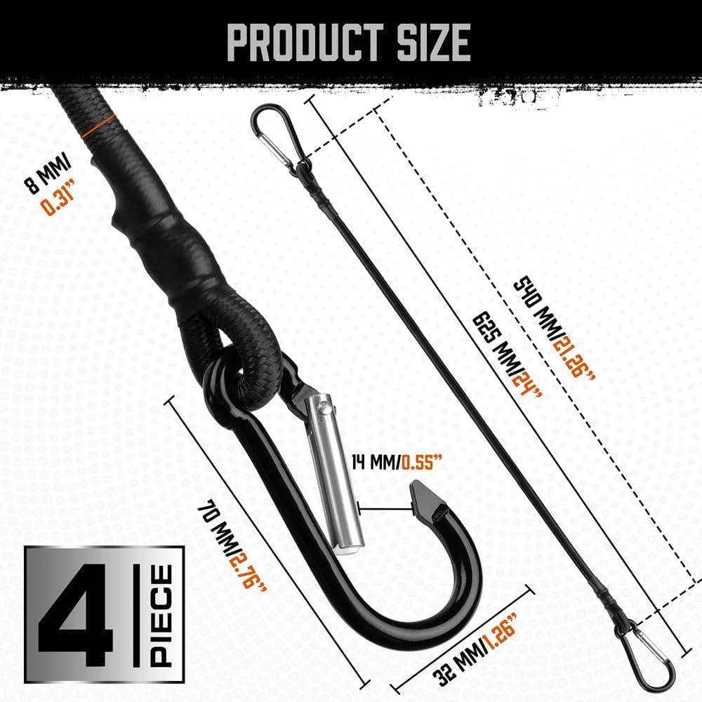 • تتضمن مجموعة الحبال المطاطية 4 قطع من الحبل المطاطي مقاس 24 بوصة مع خطاف حلقة.