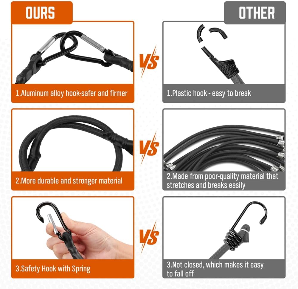 • إنه أقوى وأكثر ثباتًا من حبل البنجي العادي. إنها مناسبة لرف السقف، والمقطورة، والعربة، والقارب، والقافلة، والتخييم، وربط القماش الزيتي، إلخ.