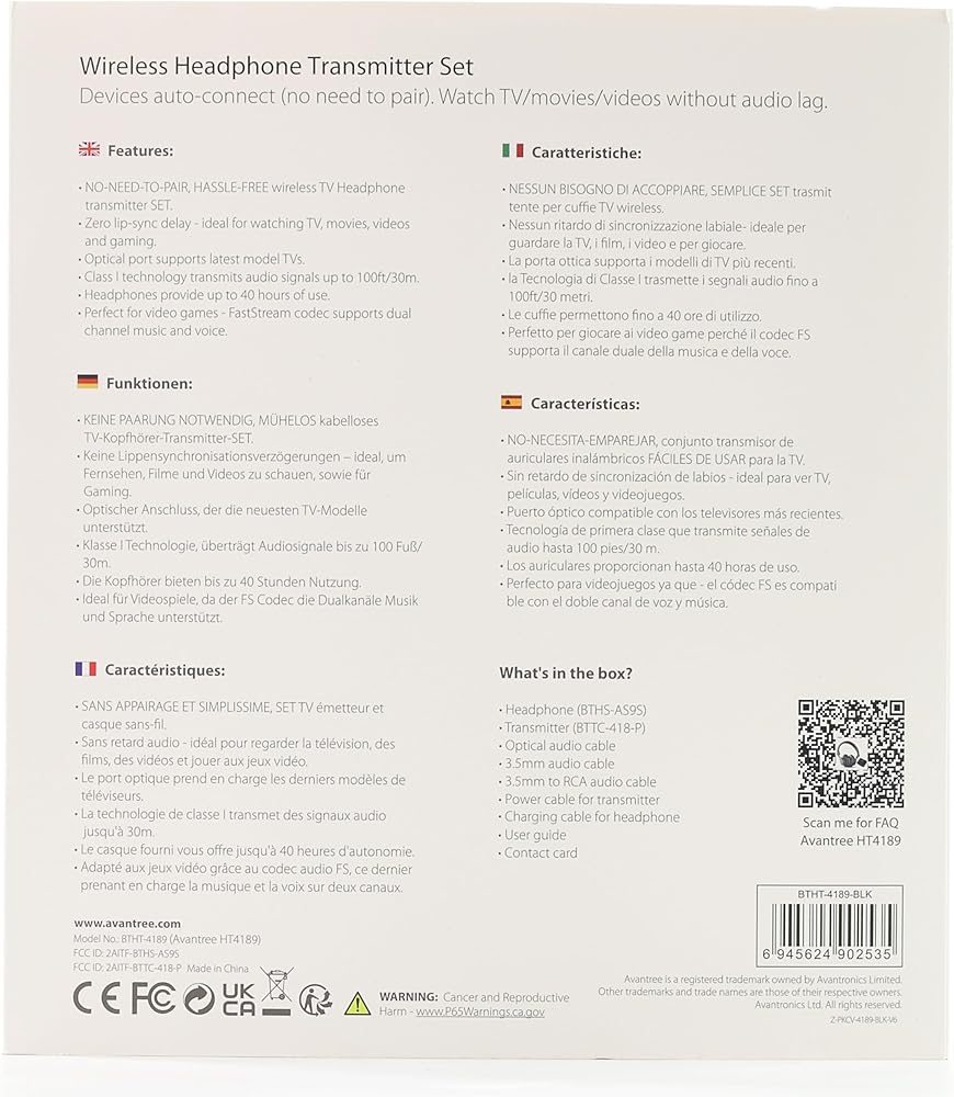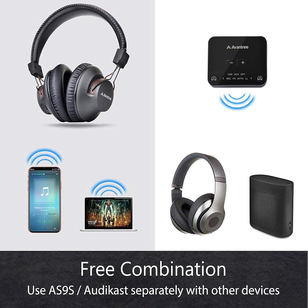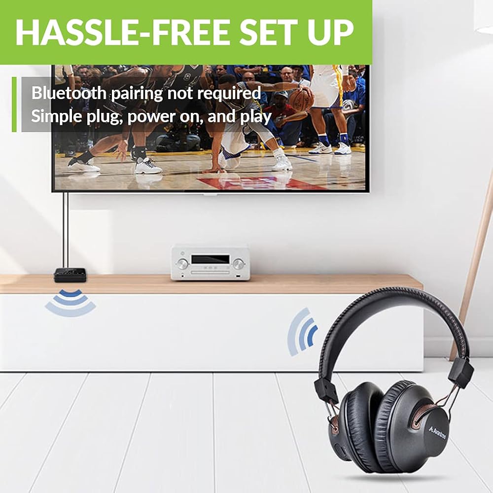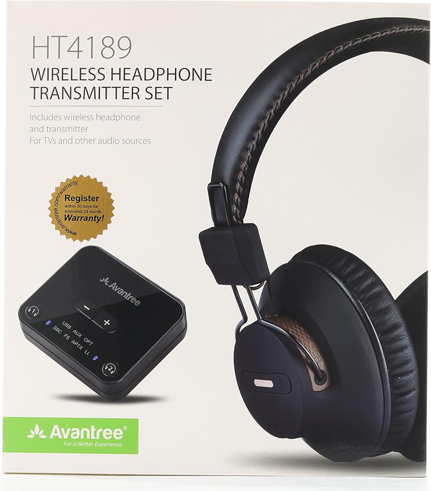 مجموعة سماعات Avantree HT4189 اللاسلكية لمدة 40 ساعة لمشاهدة التلفزيون مع جهاز إرسال (AUX RCA الرقمي البصري)، بدون تأخير، دعم الرابط المزدوج، سماعة رأس عالية الحجم فوق الأذن لكبار السن، طويلة المدى