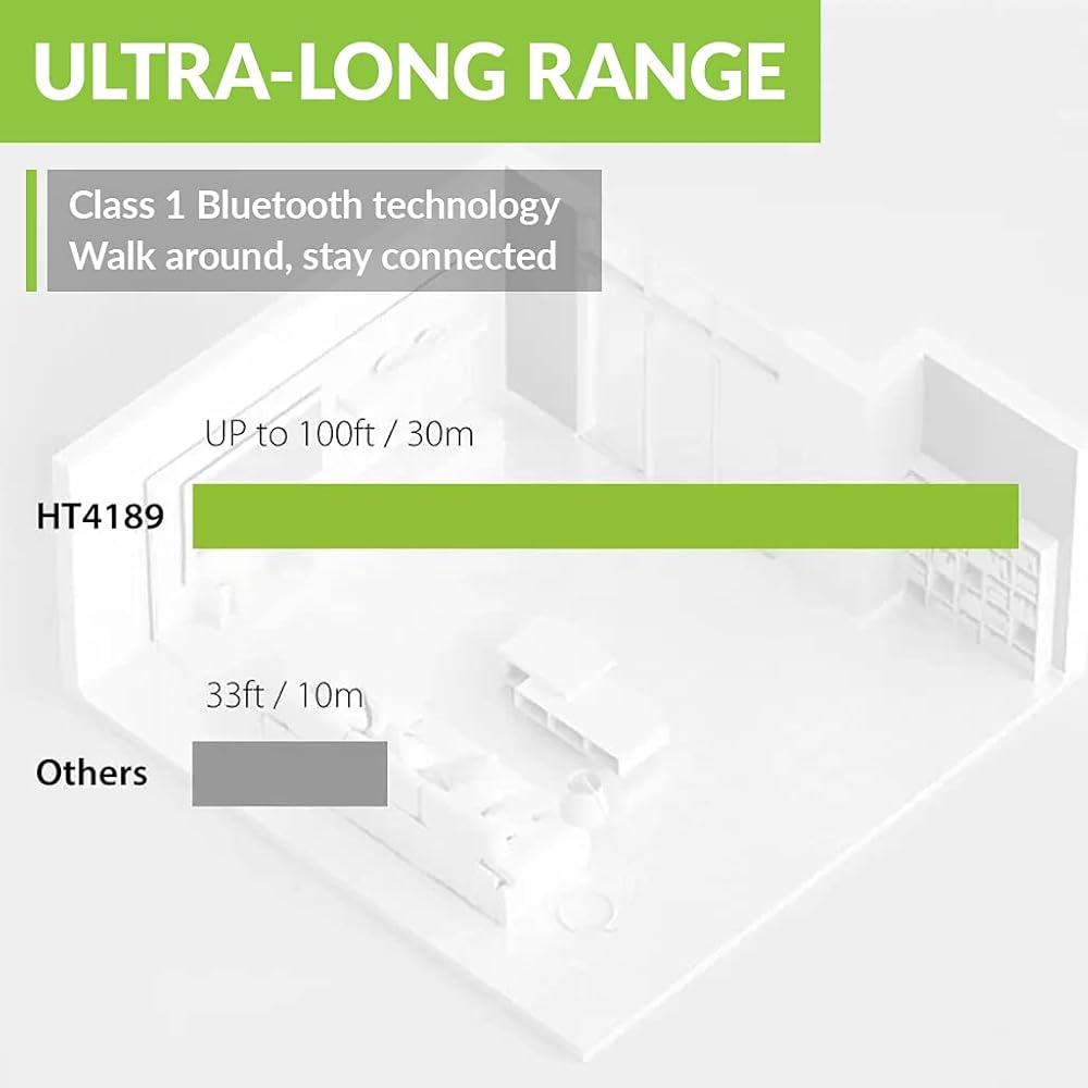 【نطاق ممتد】 مزود بأعلى نطاق بلوتوث، الفئة 1، HT4189 يضمن اتصالًا مستقرًا وموثوقًا يصل إلى 100 قدم (~30 مترًا، باستثناء أي تداخل مادي أو لاسلكي مفرط). هل تحتاج إلى البدء في إعداد العشاء؟ لا توجد مشكلة، تحرك في جميع أنحاء المنزل وافعل ما تريد القيام به دون القلق بشأن انقطاع الصوت.