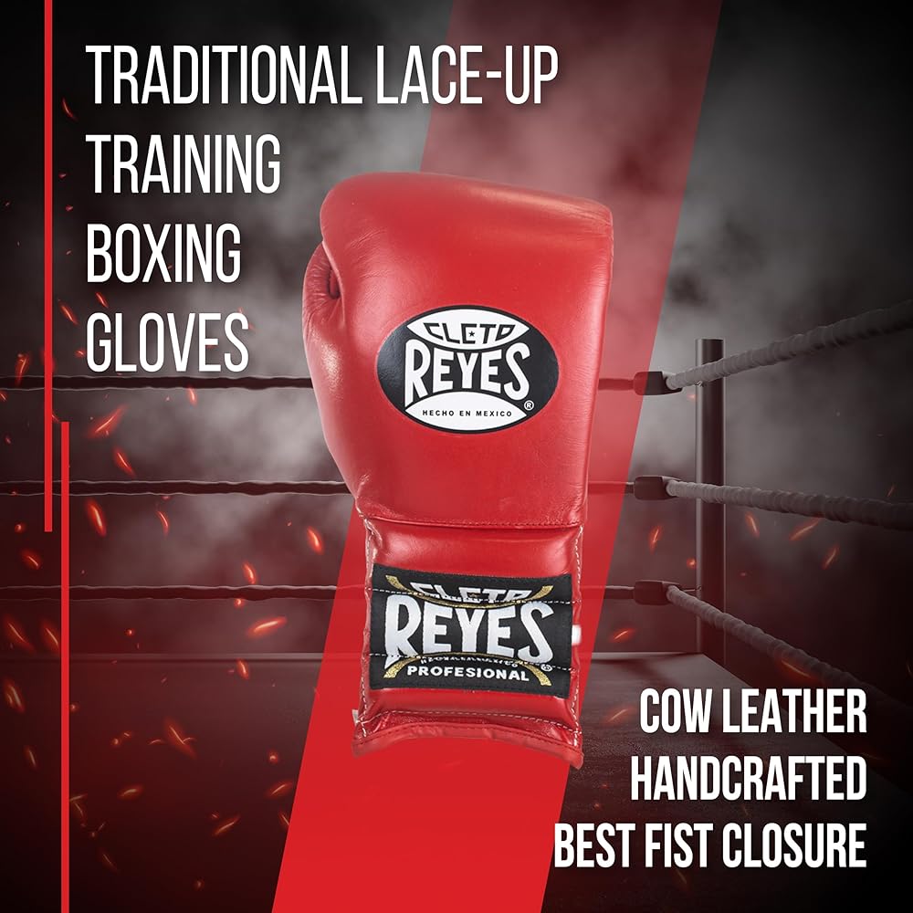 قفازات الملاكمة التقليدية ذات الأربطة - قفازات الملاكمة شديدة التحمل من CLETO REYES مصنوعة يدويًا في المكسيك من جلد البقر، ومصممة تشريحيًا مع منطقة مفصل منحنية مناسبة للشكل من أجل إغلاق أفضل للقبضة.