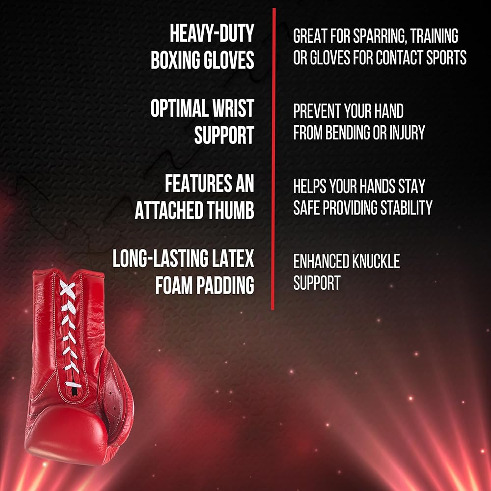 مواد عالية الجودة - قفازات الملاكمة مع إغلاق تقليدي بأربطة وبطانة إسفنجية من اللاتكس تدوم طويلاً لتعزيز دعم المفاصل. تتميز قفازات تدريب الملاكمة بإبهام مرفق يساعد يديك على البقاء آمنًا مما يوفر الثبات ويساعد إبهامك على البقاء سليمًا أثناء التدريب.