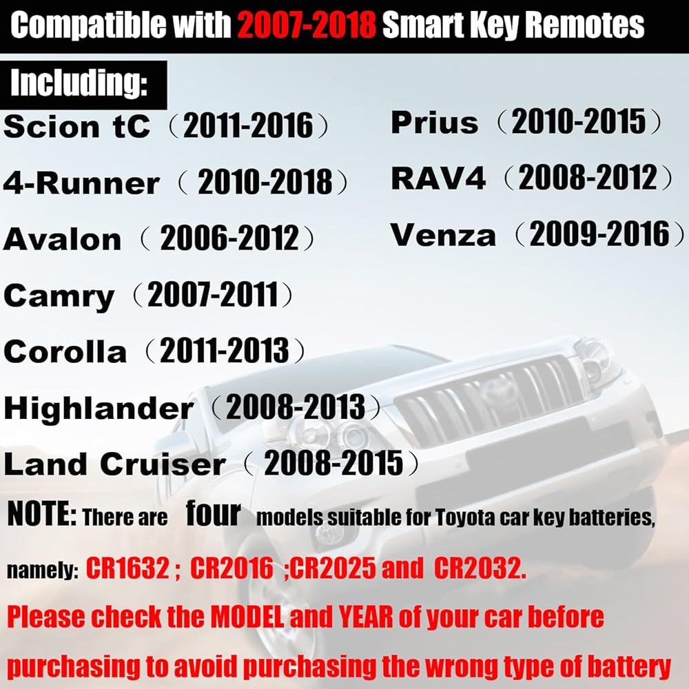 • ★بطاريات OEM CR1632 تم اختبارها للعمل مع: Scion tC (2011-2016) / 4-Runner (2010-2018) / Avalon (2006-2012) / Camry (2007-2011) / Corolla (2011-2013) / Highlander (2008) -2013)/لاند كروزر (2008-2015)/بريوس (2010-2015)/راف 4 (2008-2012)/فينزا (2009-2016)