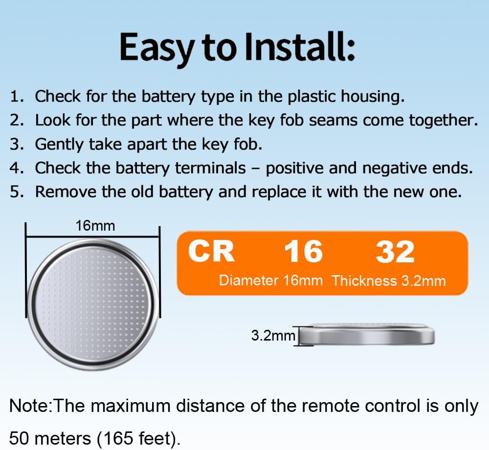 • ★ بطارية CR1632 الأصلية - البطاريات المتضمنة هي بطاريات أصلية OEM CR1632 3V لأجهزة التحكم عن بعد للمفاتيح الذكية 2007-2018. [ملاحظة - هناك أربعة أنواع من البطاريات المناسبة لأجهزة التحكم عن بعد من تويوتا، وهي: CR1632، وCR2016، وCR2025، وCR2032. يرجى التحقق من طراز وسنة سيارتك قبل الشراء لتجنب شراء نوع خاطئ من البطارية (أو التحقق من رقم الطراز المطبوع على البطارية القديمة).]
