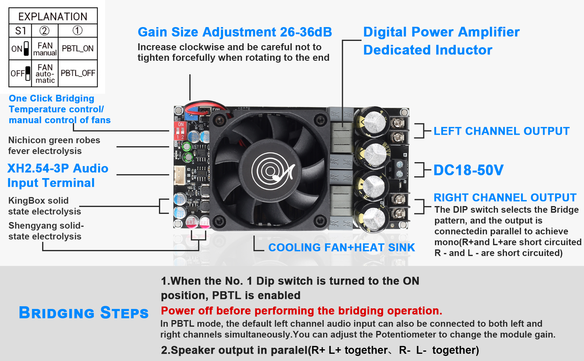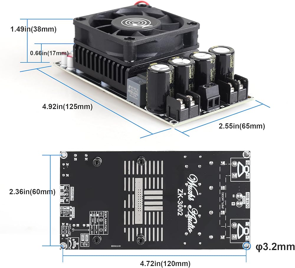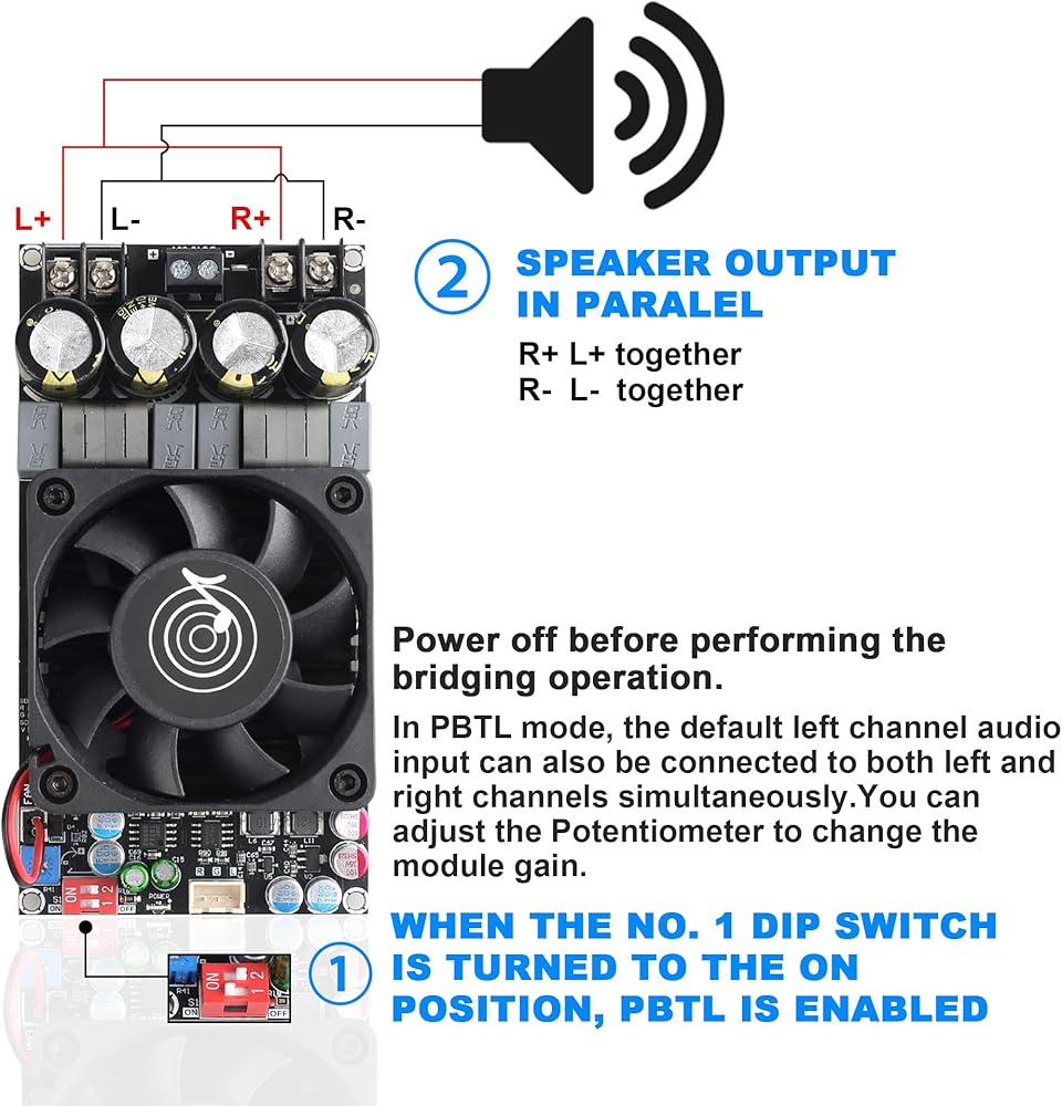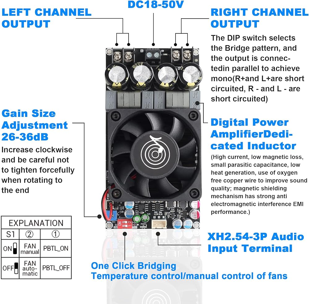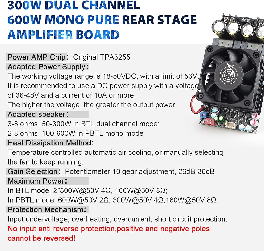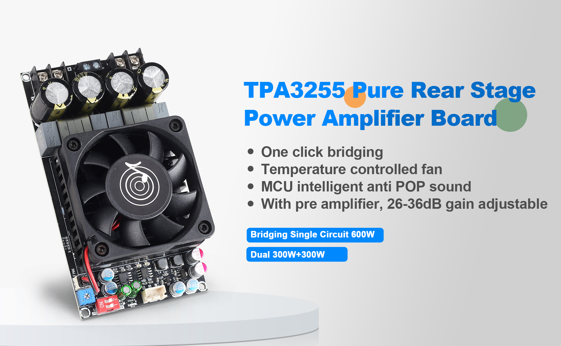 【رقاقة TPA3255】 تتميز بشريحة TPA3255 المتقدمة، ويتضمن مضخم الصوت الخاص بنا تقنية معالجة الصوت الرقمية المتطورة، مما يوفر تجربة صوتية استثنائية. يسمح أداء تحويل الطاقة الفعال بإخراج ثنائي القناة 300 واط + 300 واط وإخراج قوي أحادي القناة 600 واط، مما يضمن إخراج صوت قوي وواضح.