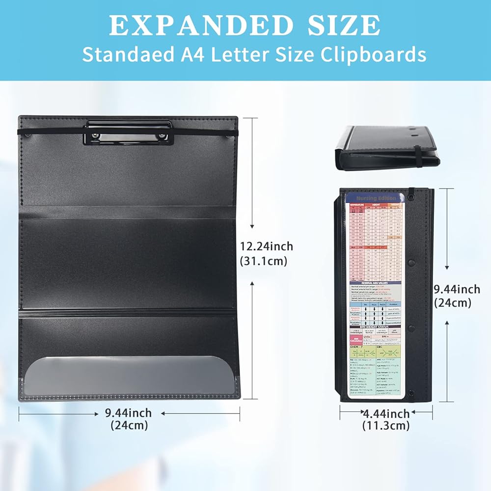 الحجم: الحجم الكامل لحافظة الممرضة 9.44 × 12.24 بوصة، والحجم القابل للطي 4.44 بوصة × 9.4 بوصة.