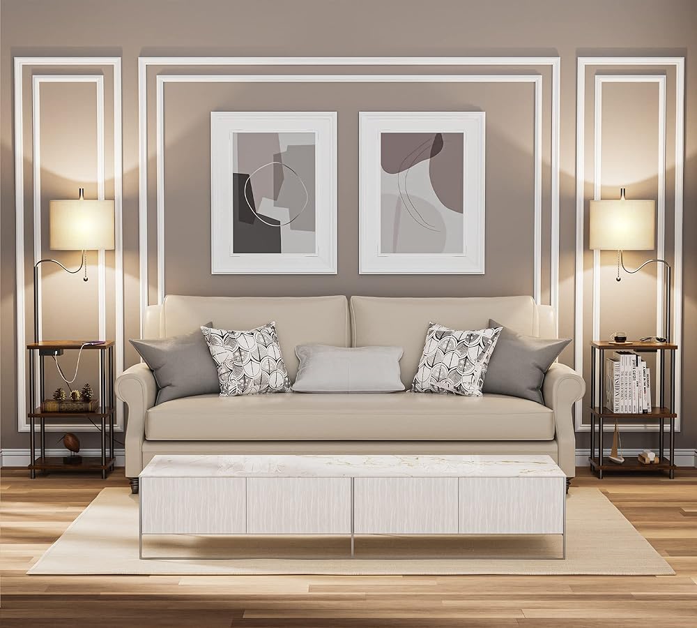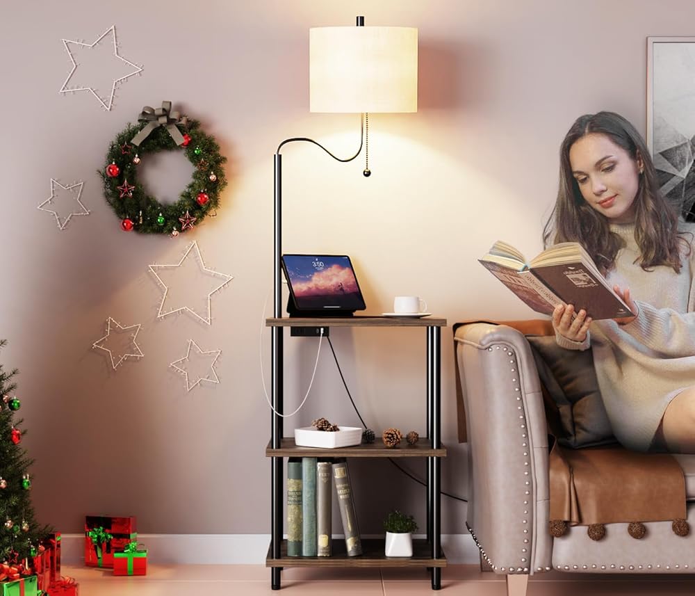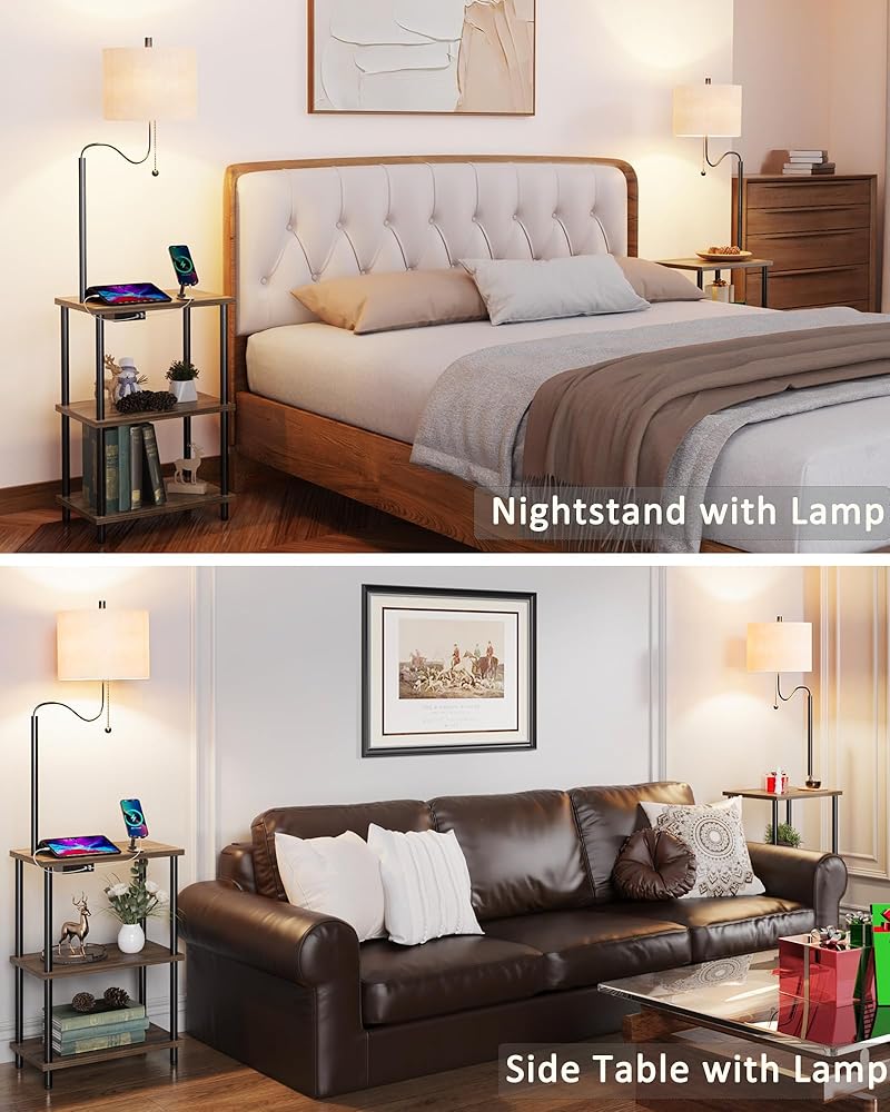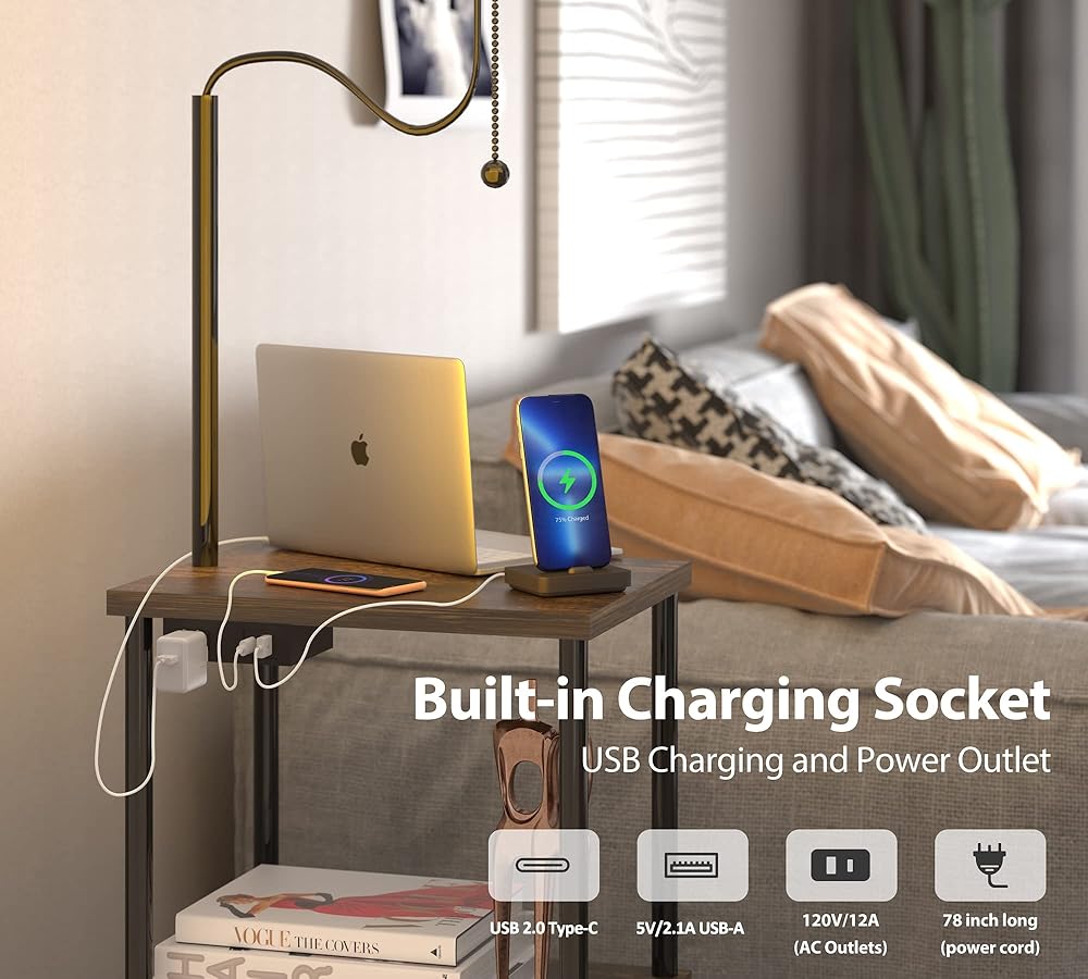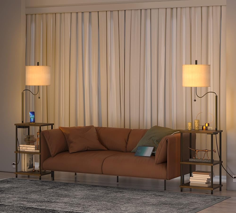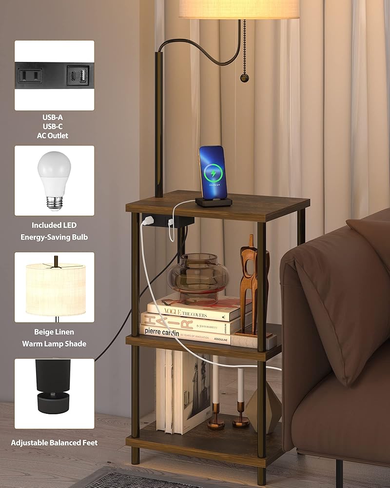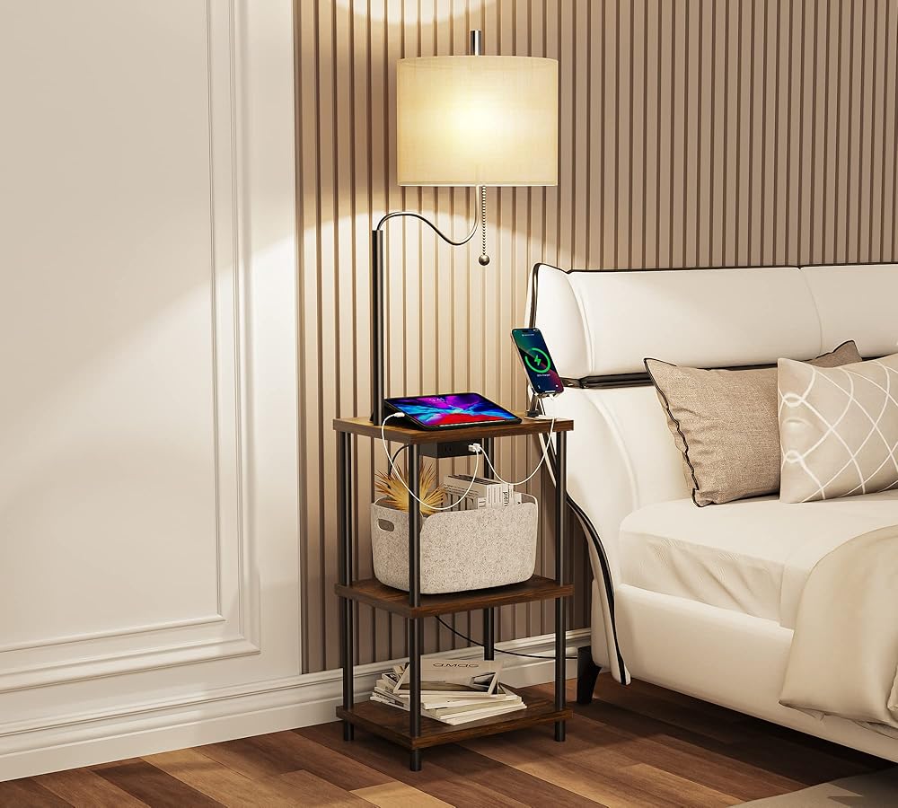 مجموعة من مصباحين أرضيين مع طاولة، وطاولة نهاية مع منفذ شحن USB من النوع C، ومنفذ طاقة، وأرفف منضدة بجانب السرير، وطاولة جانبية مع ضوء قائم للقراءة لغرفة المعيشة وغرفة النوم (بني)