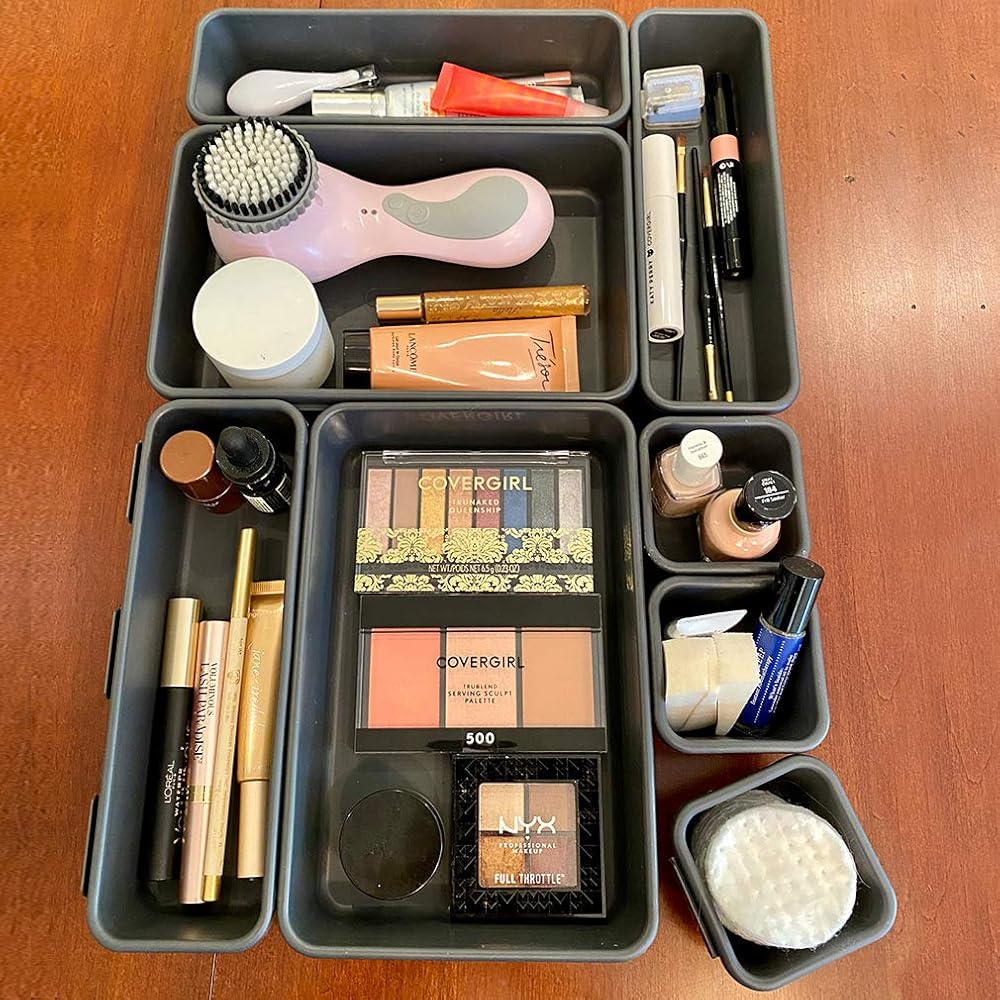 صناديق تنظيم الأدراج الخاصة بنا ضحلة بما يكفي لتناسب أدراجك، ويمكنك مزجها ومطابقتها بحرية لزيادة سعة التخزين في أدراجك، وتنظيم إكسسوارات الموضة الخاصة بك وتخزين الأشياء الصغيرة الأخرى.