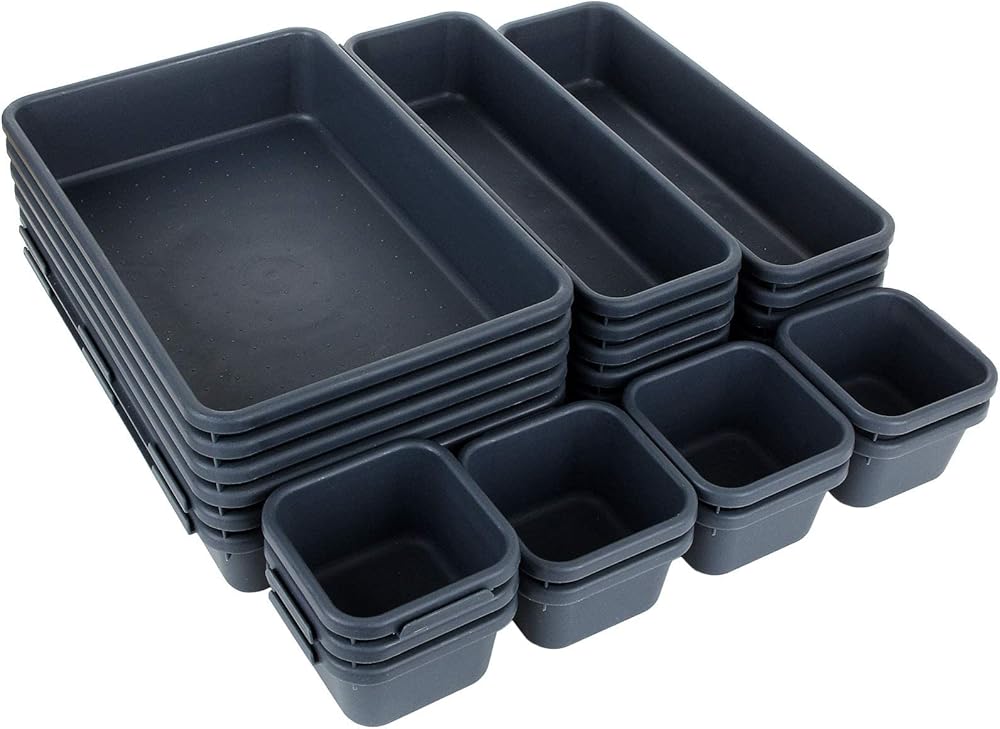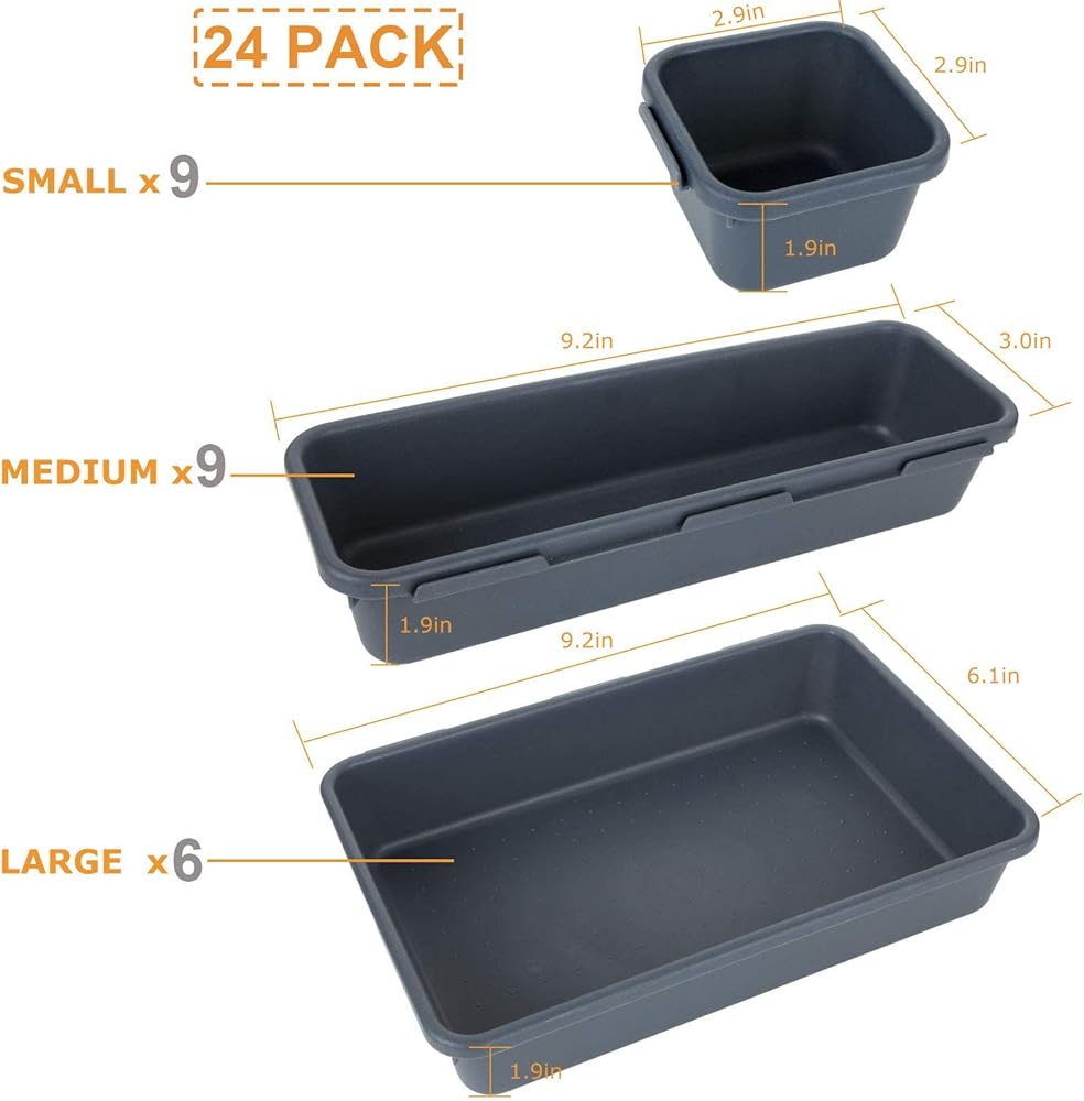 24 علبة منظم أدراج المكتب، تتضمن 6 × كبير (9 × 6 × 2 بوصة)، 9 × متوسط (9 × 3 × 2 بوصة)، 9 × صغير (3 × 3 × 2 بوصة)، منظمات أدراج ضيقة مختلفة الحجم والتي يمكنك تخصيص التخطيط.